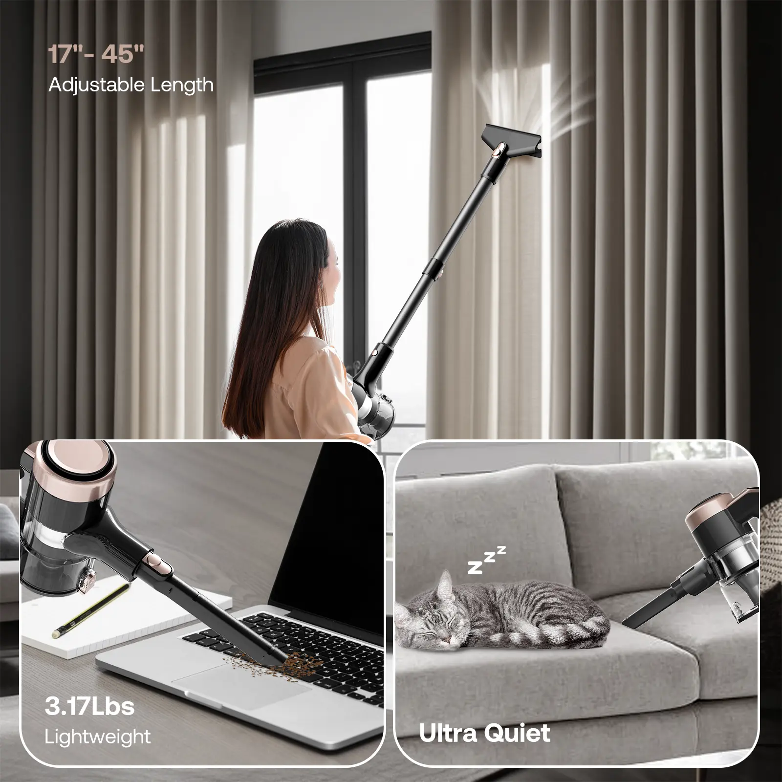 The suction is amazing. The lowest speed works very well so I hardly have to go higher than that. My only issue is it doesn’t stand on its own. It would be nice if it had a lock on to bottom to make it stand and is also on the louder side. Other than that I have no complaints. Beautiful pink color.