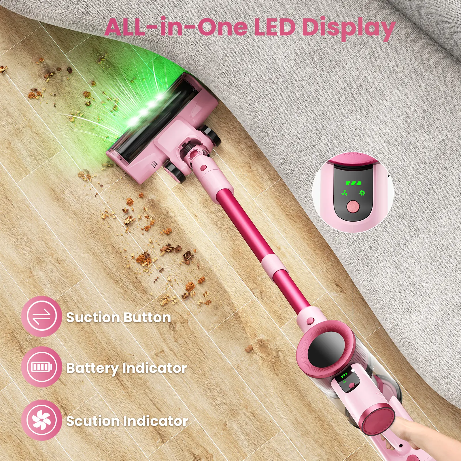 The S2 Rechargeable Cordless Vacuum features an innovative anti-tangle brush head that actively separates and trims hair during cleaning, preventing pet hair blockages – ideal for households with pets. The upgraded green LED dust detection light illuminates fine dust and tiny pet dander invisible under normal lighting.