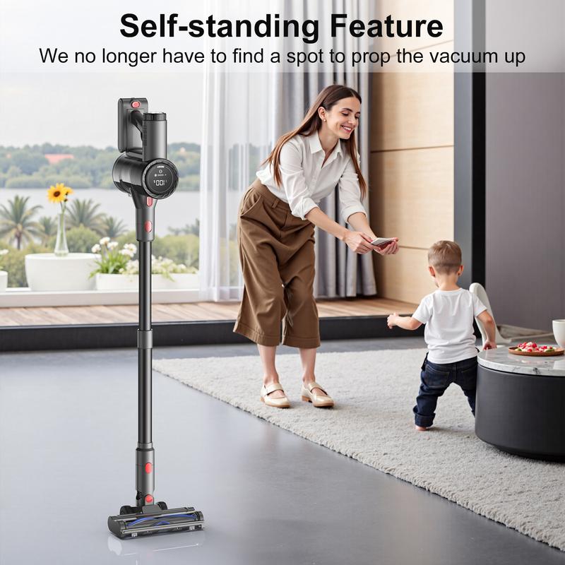 Powerful 46Kpa Suction & 500W Powerful Motor:This cordless vacuum is equipped with a 500W motor, delivering stronger power, lower noise, and extended battery life. With two adjustable suction modes reaching up to 46Kpa, it effortlessly tackles dust, debris, pet hair, cat litter, and even dog food, making it ideal for various cleaning needs across different surfaces.