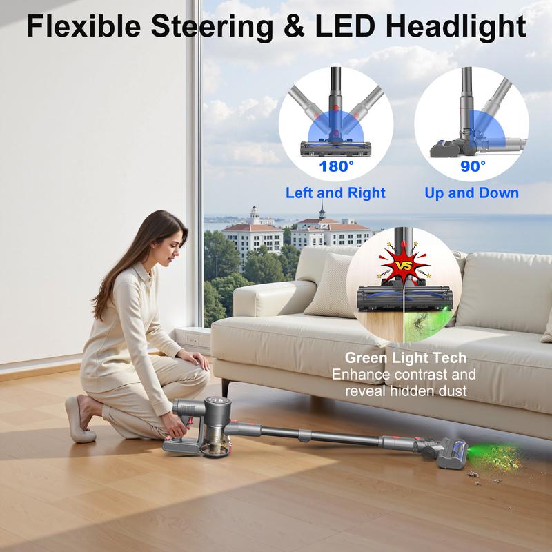 Flexible LED Motorized Brush with Green Light:The 180° swivel brush features built-in green LED lights, which highlight even the tiniest dust and hair that ordinary white lights often miss—making invisible dirt visible. Easily glides under furniture and into corners. Designed to prevent hair tangling, it’s ideal for whole-house cleaning, especially in homes with pets and children.