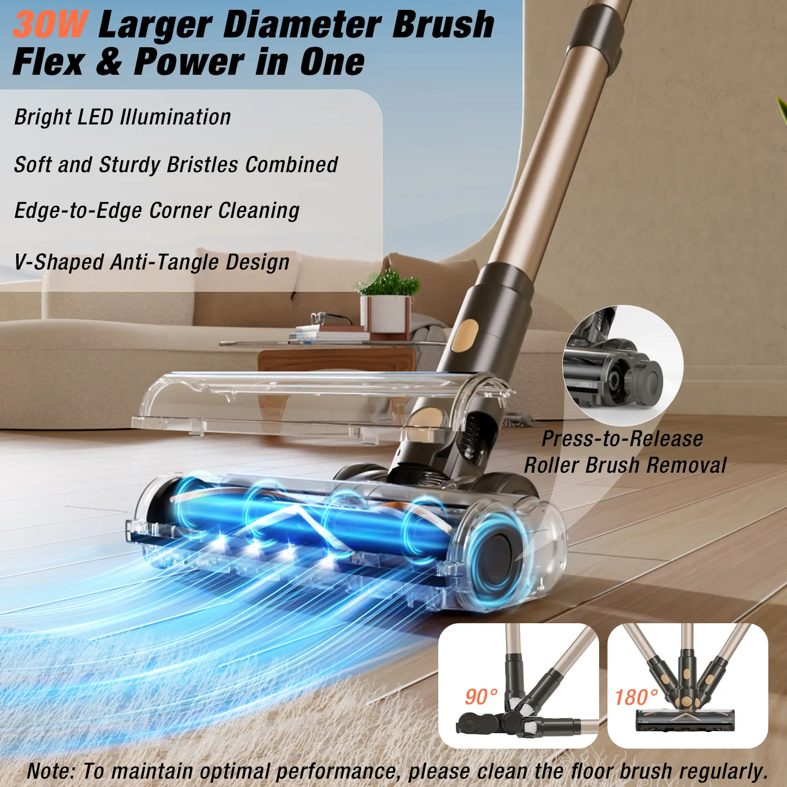·【Anti-Tangle & Multi-Functional Attachments】 This stick vacuum includes a 30W 5C high-power floor brush with a comb structure and V-shaped large-diameter roller to reduce hair tangles. The flexible LED head easily reaches dark areas like under tables for thorough cleaning. The 2-in-1 soft and hard brush protects surfaces while deep-cleaning sofa seams, and the wide head brush efficiently tackles dust on large flat areas like sofas and curtains.