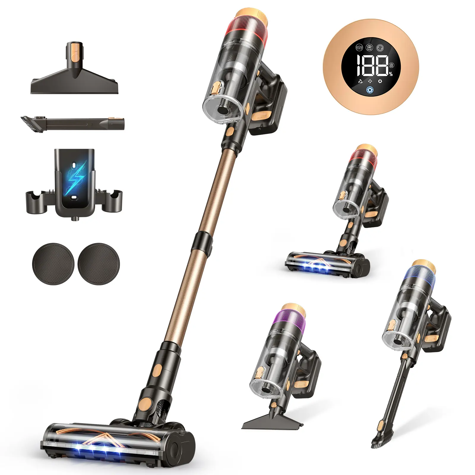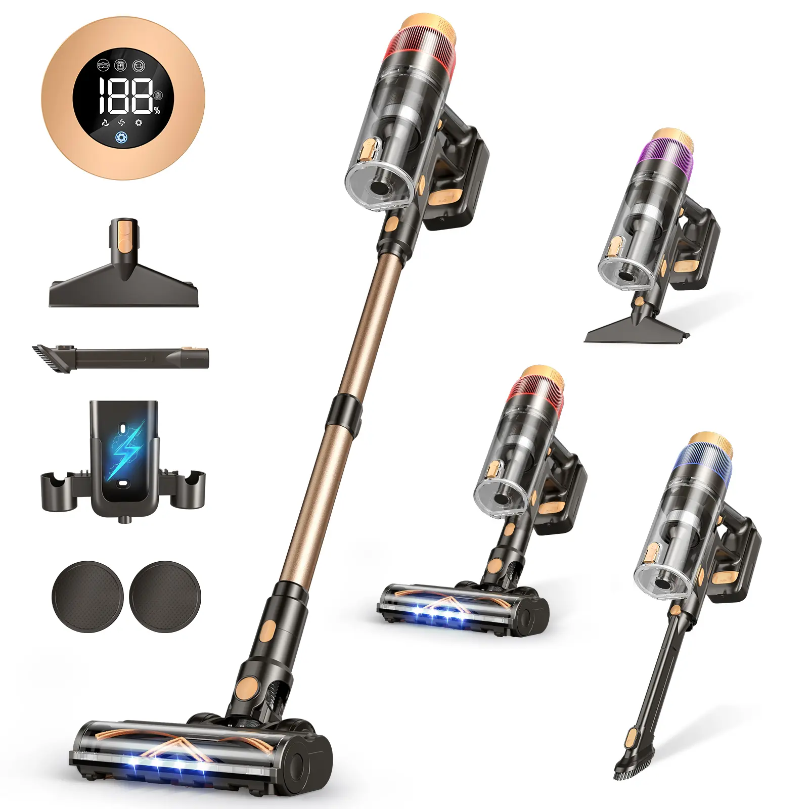 ·【580W & 48KPa Top-Tier Suction】This cordless vacuum features a upgraded 550W brushless motor and 30W high-power brush, reaching 200,000 RPM with 48KPa suction. It prevents hair tangles, reduces noise, and easily removes debris, pet hair, and dust from floors, plush carpets, corners, walls, and high areas.