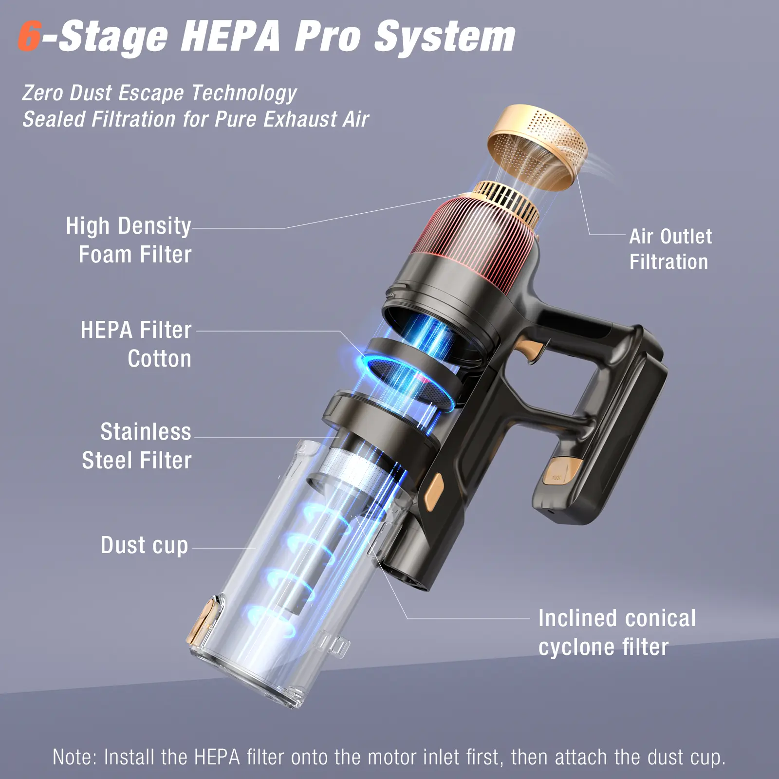 ·【6-Layer Filtration System & Tapered Cyclone Boosted Dust Collection】 The cordless vacuum features an inclined cyclone filtration system that uses high-pressure airflow to direct dust to the bottom of the 1.8L dust cup, preventing clogs and extending the HEPA filter and motor lifespan. The high-density HEPA captures 99.99% of fine dust and large particles, while the conical metal filter saves space for efficient, low-maintenance
