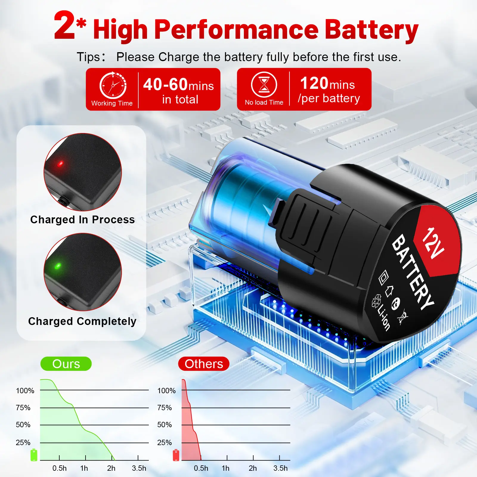 【Flash Charging, Intelligent Display and Long-Lasting Battery Life】Dual 1300mAh large-capacity batteries, 40-60 minutes of continuous operation, 2 hours of ultra-fast charging; intelligent real-time power display, the power status is clear at a glance without power outage.