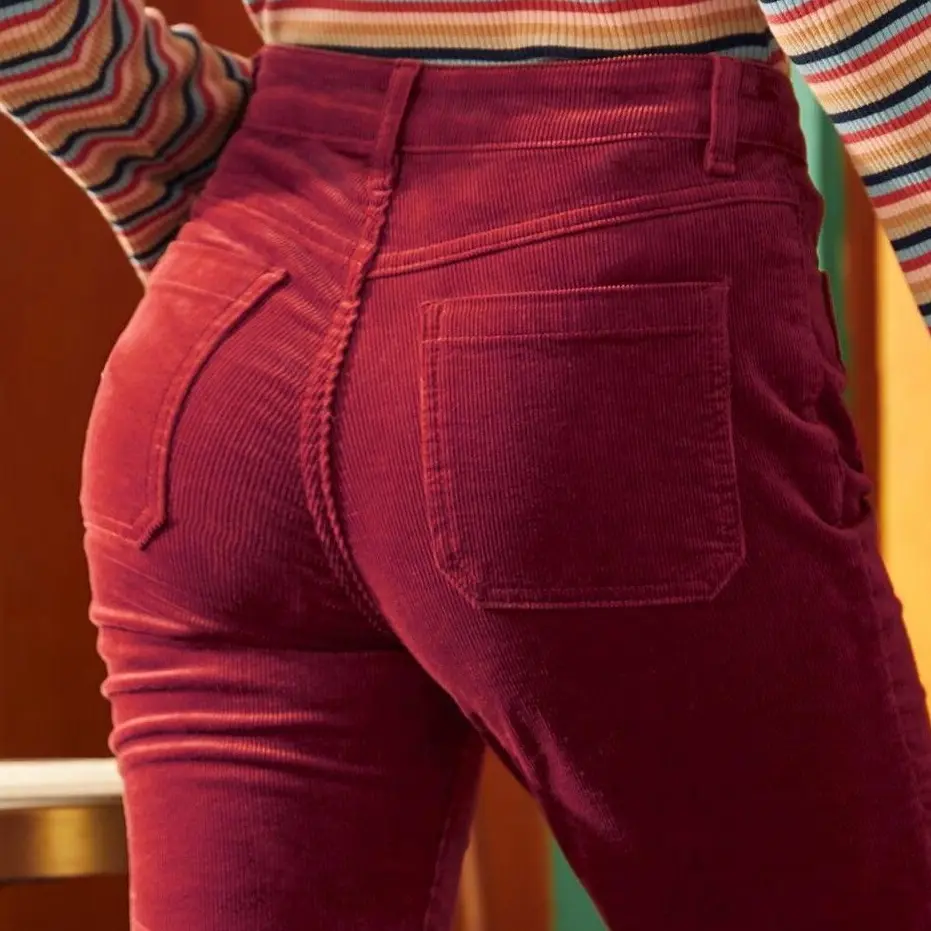 Same deep red color as in the photo. I'm 6'1"-6'2", 135 lb. with a 36" inseam, 27" waist and 38" hips. I ordered a size 6 based on the website size chart and it fits a little snug. I have a relatively short torso, so I usually like to get pants with a mid or low rise to balance out my torso. These pants fit right below my belly button. The corduroy has a velvety texture on the outside. With this size and my height, the hem barely brushes the top of my foot. Since I want a little more length, I will probably undo the hem or add lace at the bottom.