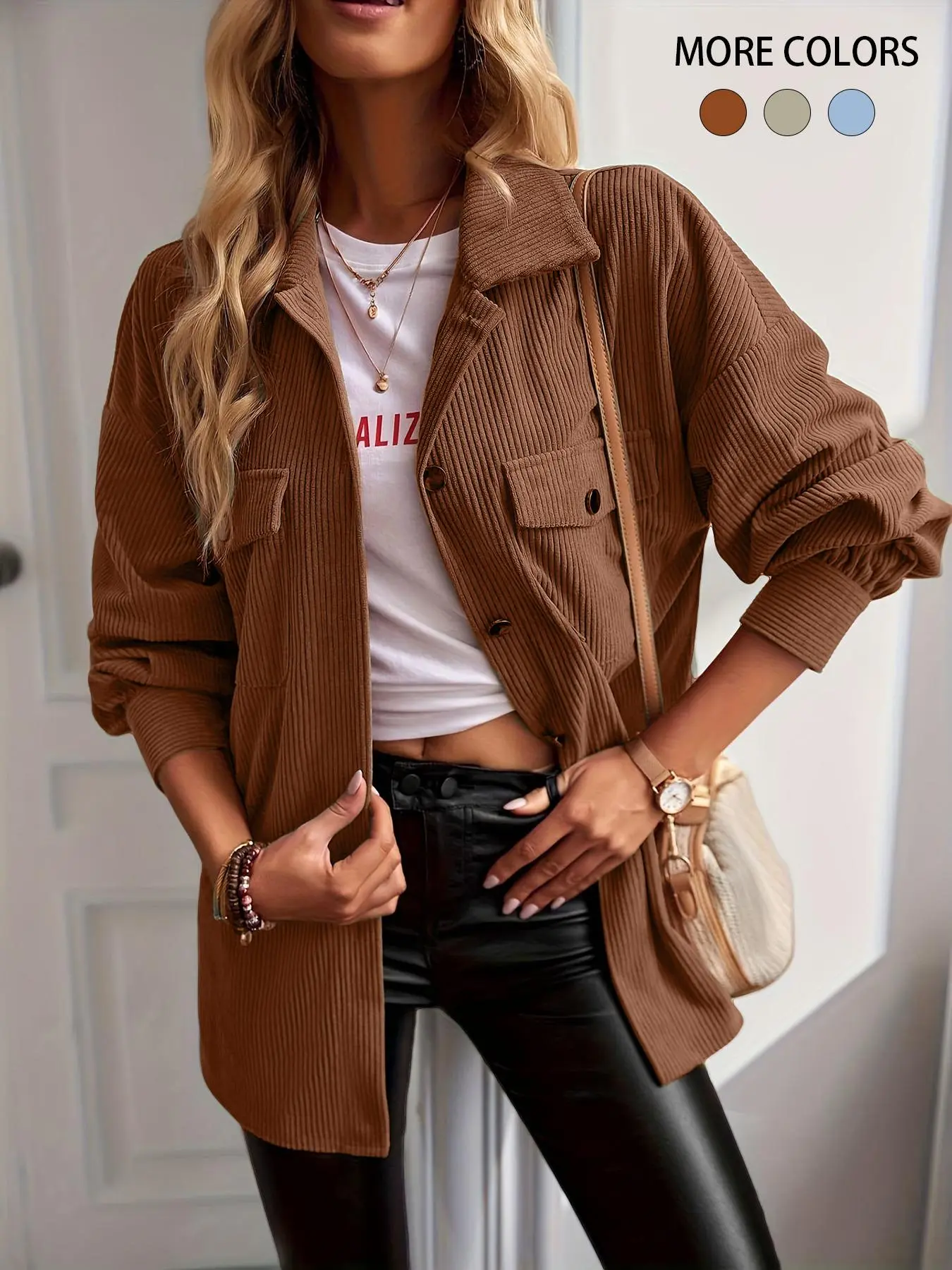 Women's Solid Button Front Long Sleeve Corduroy Jacket, Casual Drop Shoulder Outerwear for Fall & Winter, Ladies Clothes for Daily Wear #asymmetricaldenimjacket #oversizeddenimjacket #womenscoats #longwoolcoats #womenscardigan #longdenimjacket #corduroyshirt #plussizejeanjacket #womensspringjackets #saunajacketsforwomen