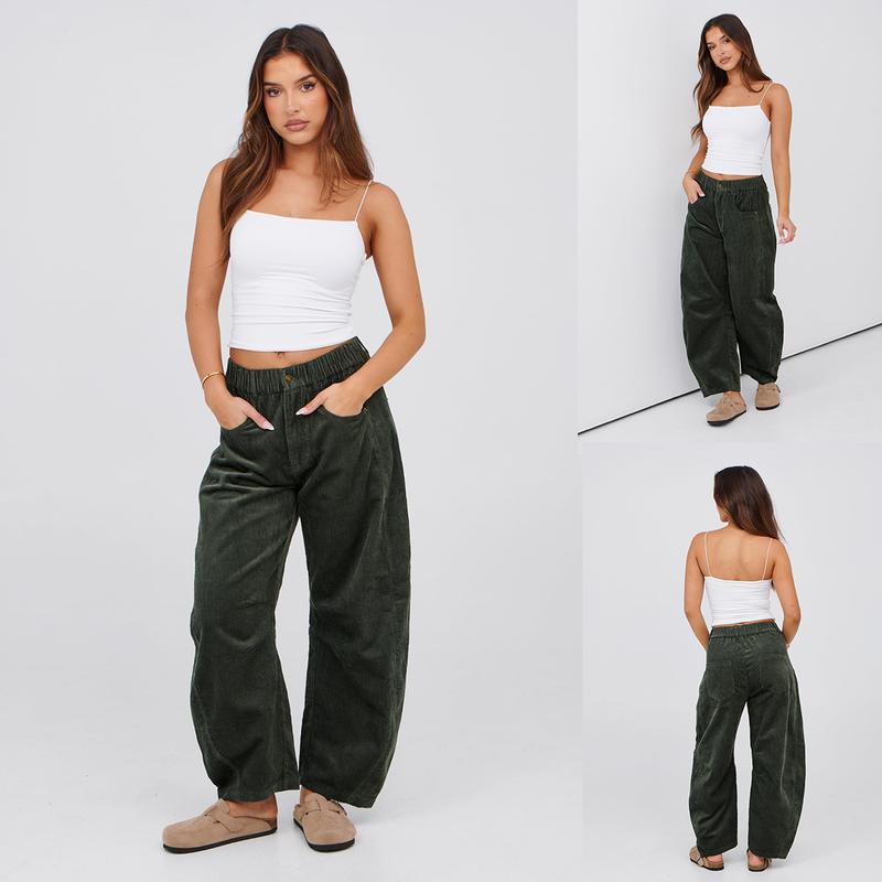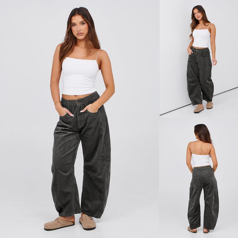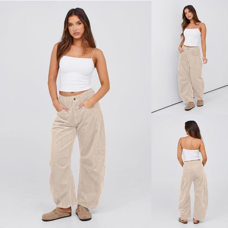 These corduroy pants for women boast a comfy elastic waist, button closure, and 4-pocket design. The wide barrel leg and seam details add a stylish touch. Belt loops at the waistband enhance functionality. Perfect for casual outings, these pants offer a relaxed fit. 🧦