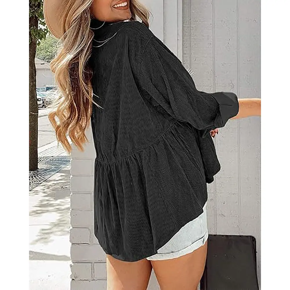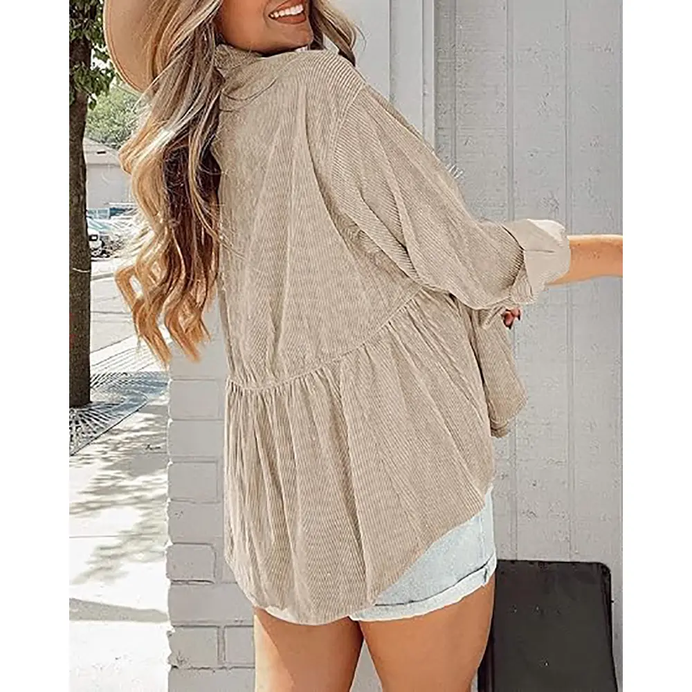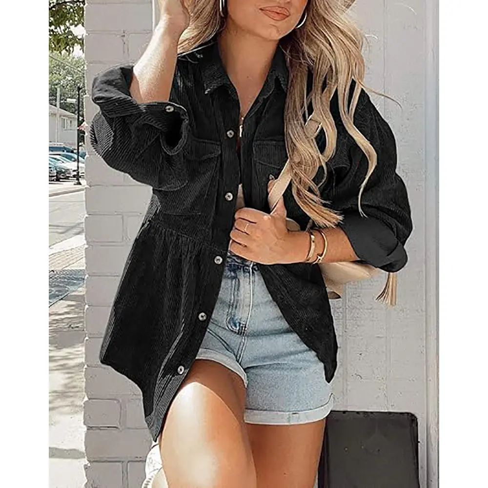 Features: Corduroy fabric, solid color, front button closure, chest pocket, long sleeves with button cuffs, lapel, loose shirt. Waist-cinched, oversized boyfriend hem. Can be tied at waist or wrapped around waist, can be worn with 3/4 sleeves or full sleeves. Medium color suitable for women of all ages.