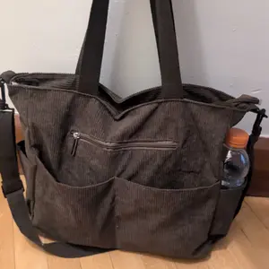 Love the brown corduroy material the tote bag is made of. Lots of room and lots of pockets. Iâm super glad there is a long adjustable strap for Crossbody or two short handles for arm bag.And the adjustable strap is removable!! WooHoooo!!
