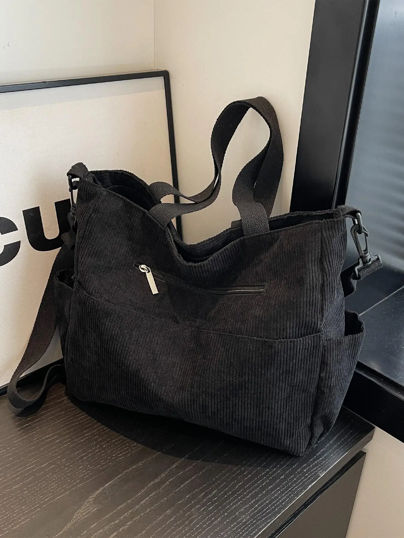 Love the brown corduroy material the tote bag is made of. Lots of room and lots of pockets. I’m super glad there is a long adjustable strap for Crossbody or two short handles for arm bag.And the adjustable strap is removable!! WooHoooo!!
