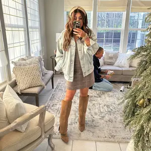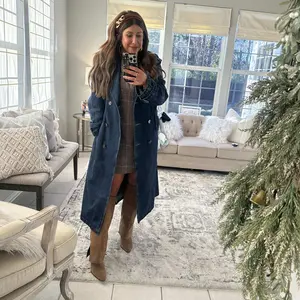 Fits true to size. Can wear it with any long sleeve. I added a belt to it to give it some style.