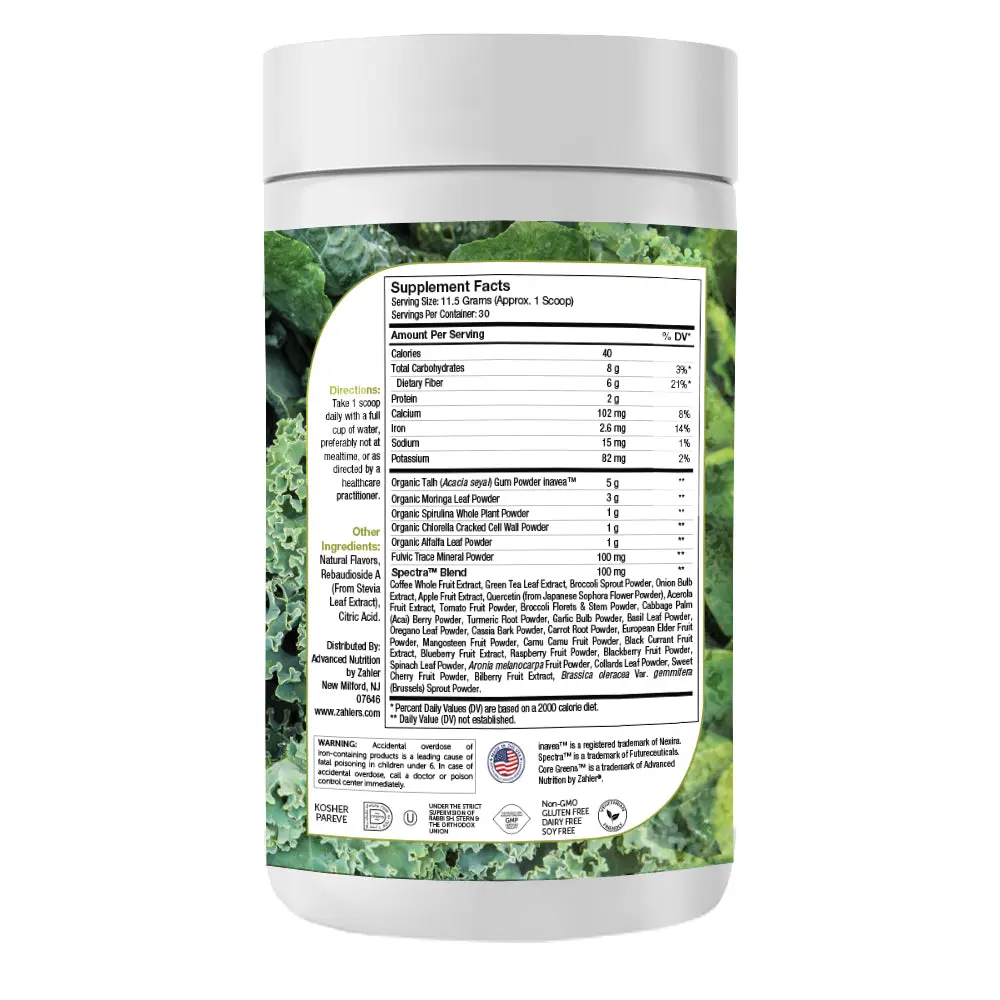 Each scoop of Zahler Core Greens Superfood Powder is packed with phytonutrient-rich greens like Spirulina, Chlorophyll, and Spectra Blend. It's loaded with vitamins, minerals, vegan protein, and antioxidants for full-body nourishment. Perfect for daily wellness, this plant-based supplement supports energy, detox, and immune health. Enjoy the benefits of green vegetables in every sip!
