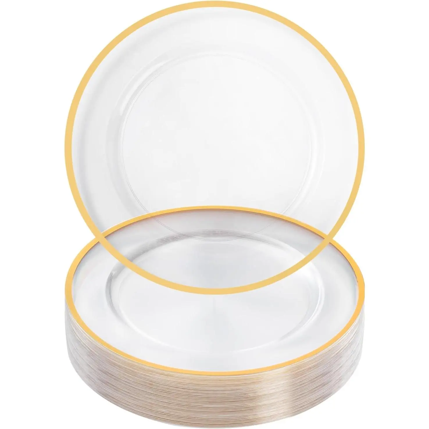 Make your table look elegant without the stress. This set includes 25pcs reusable clear charger plates with a gold rim, perfect for dinners, weddings, parties, and special events. The 12-inch plates add a stylish and cohesive look to your table, making it photo-ready and sophisticated.