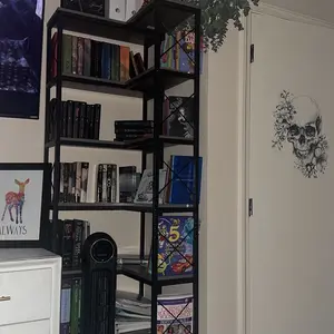 ăADD VISUAL CHARISMAă Steeped in rustic style, this wood corner shelf with matte black frame, X-bars blends functionality and self-expression together, working as a real enrichment for the lovers of industrial design furniture. This 7-shelf bookshelf is a great solution to add extra space for living room, bedroom and small apartment.