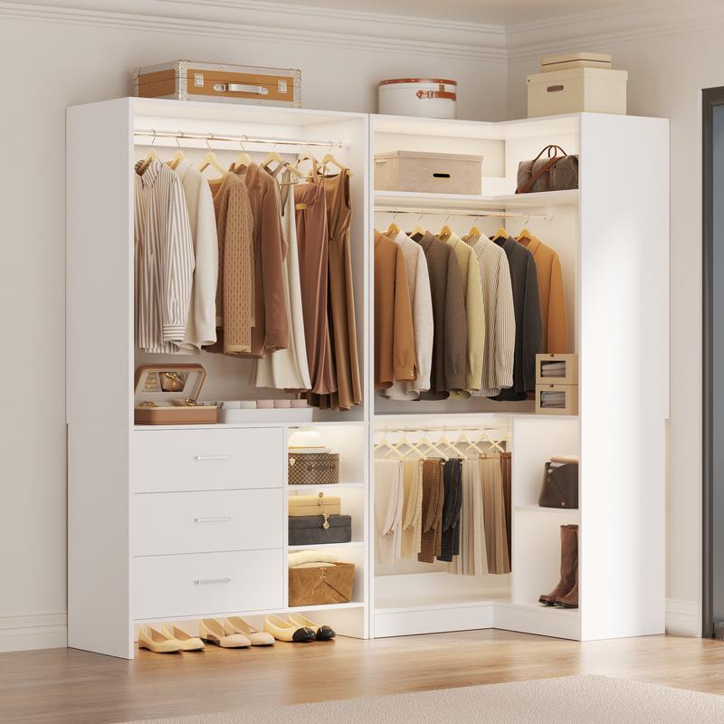 ·Multi-Functional Design: Enjoy multiple hanging rods for shirts and skirts, open shelving for bags and folded clothes, and sliding drawers for small accessories, ensuring your closet remains tidy and accessible.