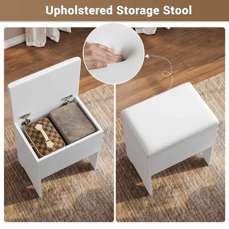 Sikaic Corner LED Makeup Vanity Desk With Storage Stool And Charging Station Mirror Drawers, Rotating Shelves