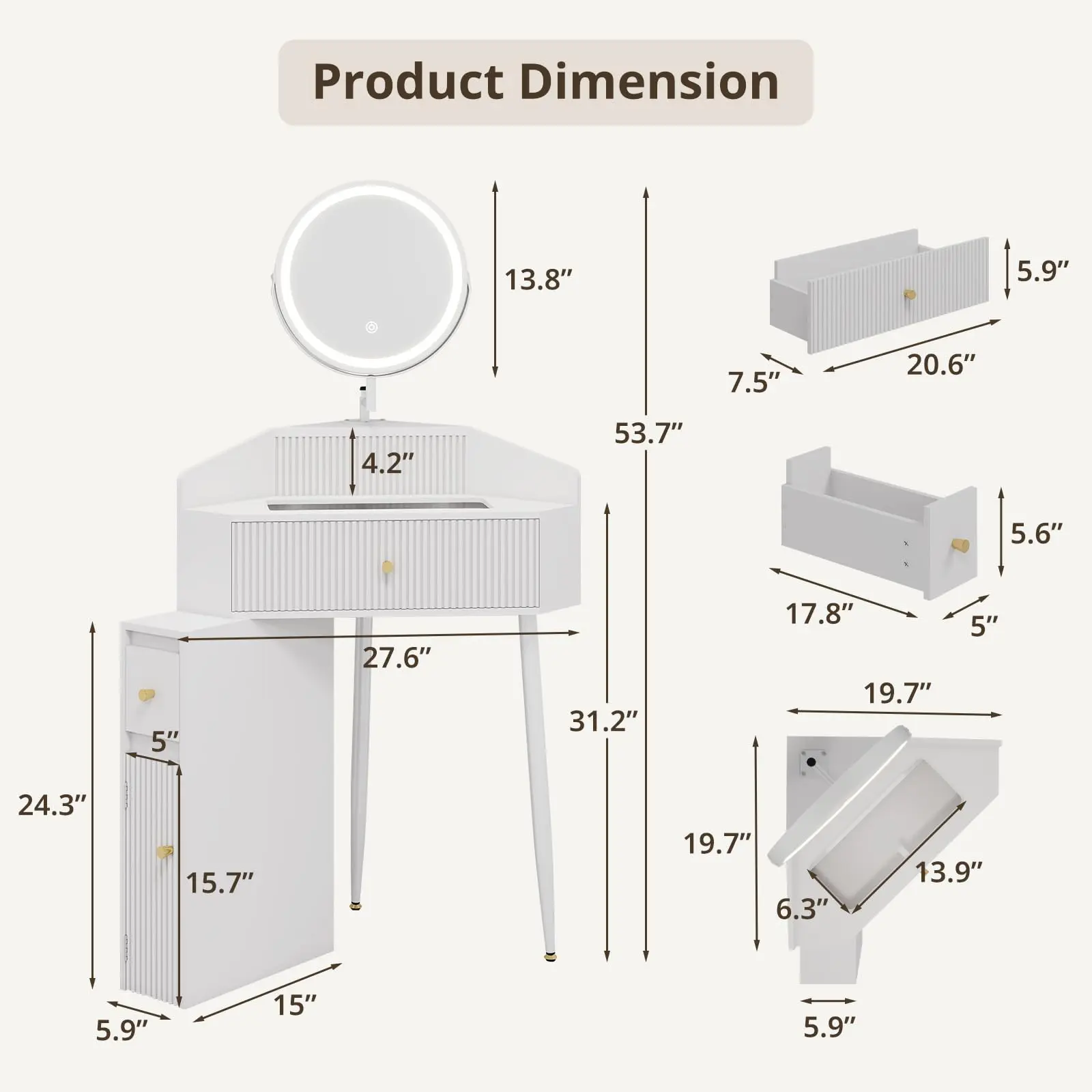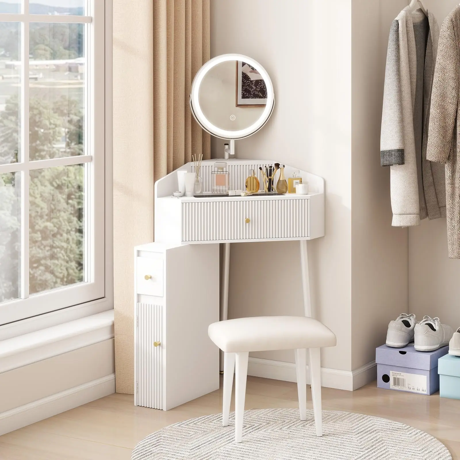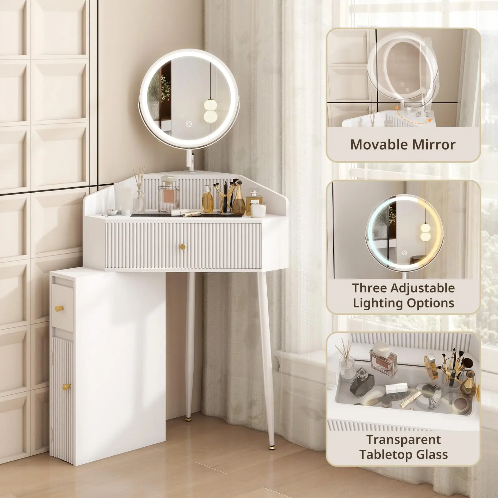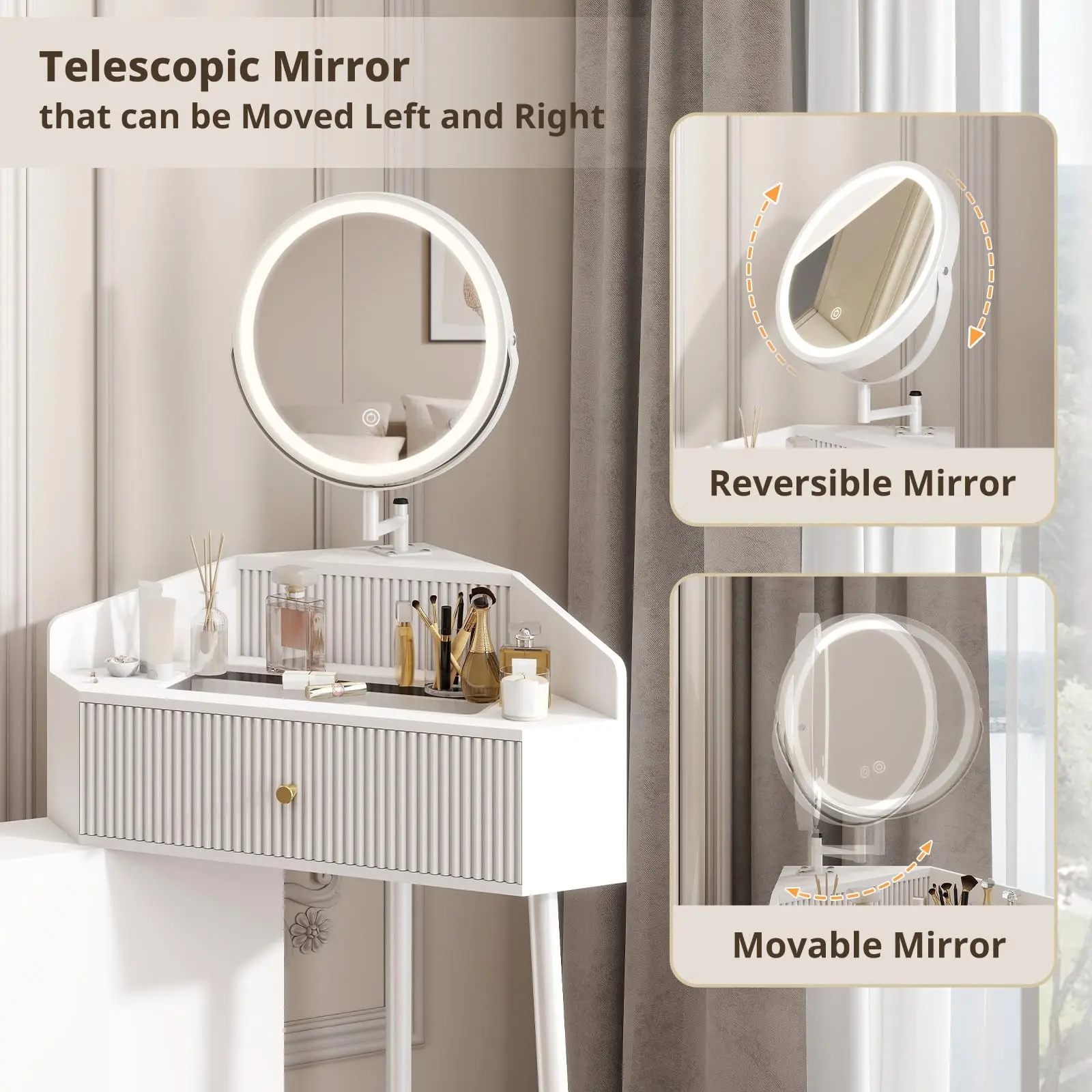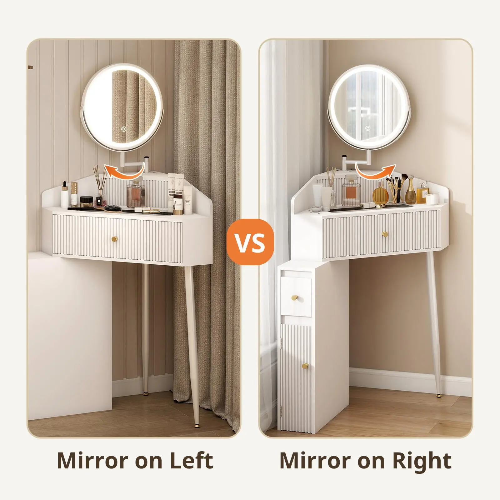 ·Space-Saving Corner Design: Our small makeup vanity fits perfectly into any small corner, ideal for compact rooms or apartments. Enjoy a functional vanity without sacrificing space