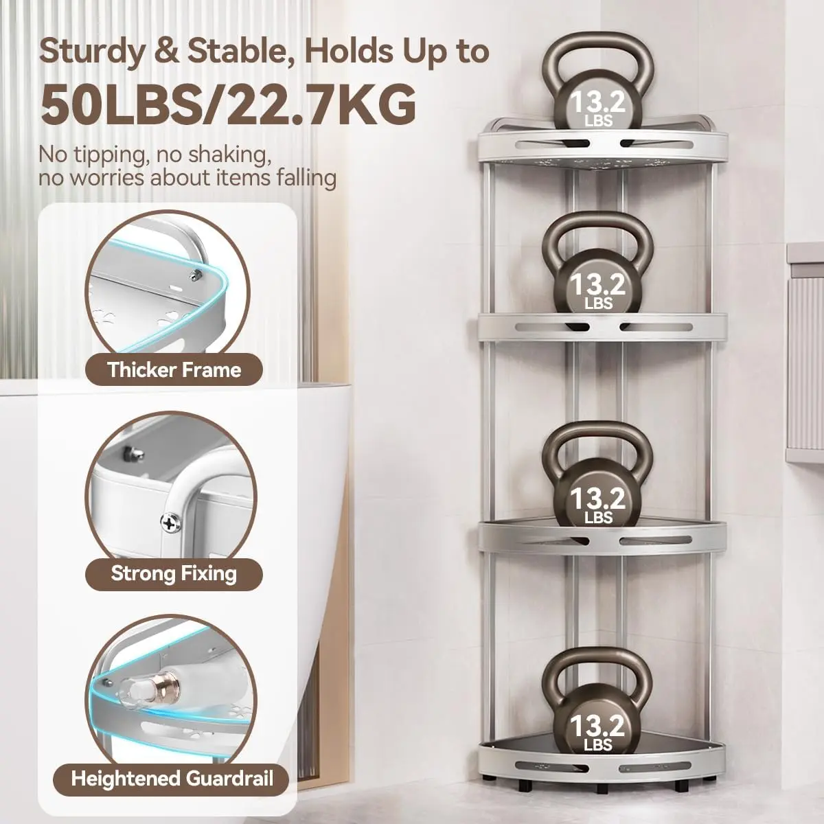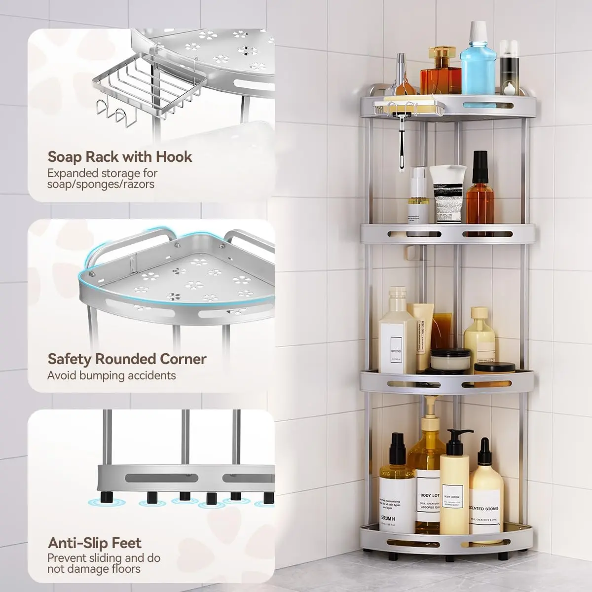·【Non-slip Corner Shower Caddy】This shower organizer standing has 7 support feet to keep steady and each of them are equipped with rubber sleeve, meaning it boasts anti-slip and anti-tilt while protecting your furniture