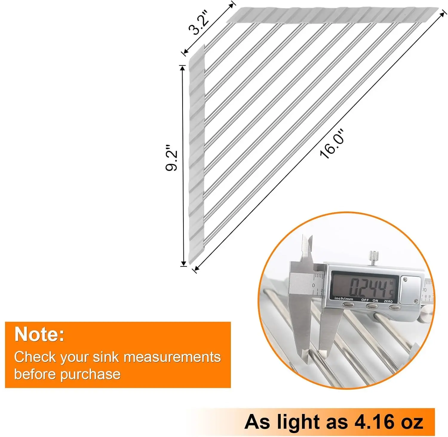 ·TRIANGLE OVER SINK DISH DRYING RACK: Bottom Length: 16”, Side Length: 9”. Made of stainless steel bars with silicone grips, this small roll up dish drying rack is well constructed, sturdy, non-slip, waterproof and durable than the plastic sponge holder for kitchen sink. Perfect kitchen gadgets and sink accessories for sink counter storage and organization.