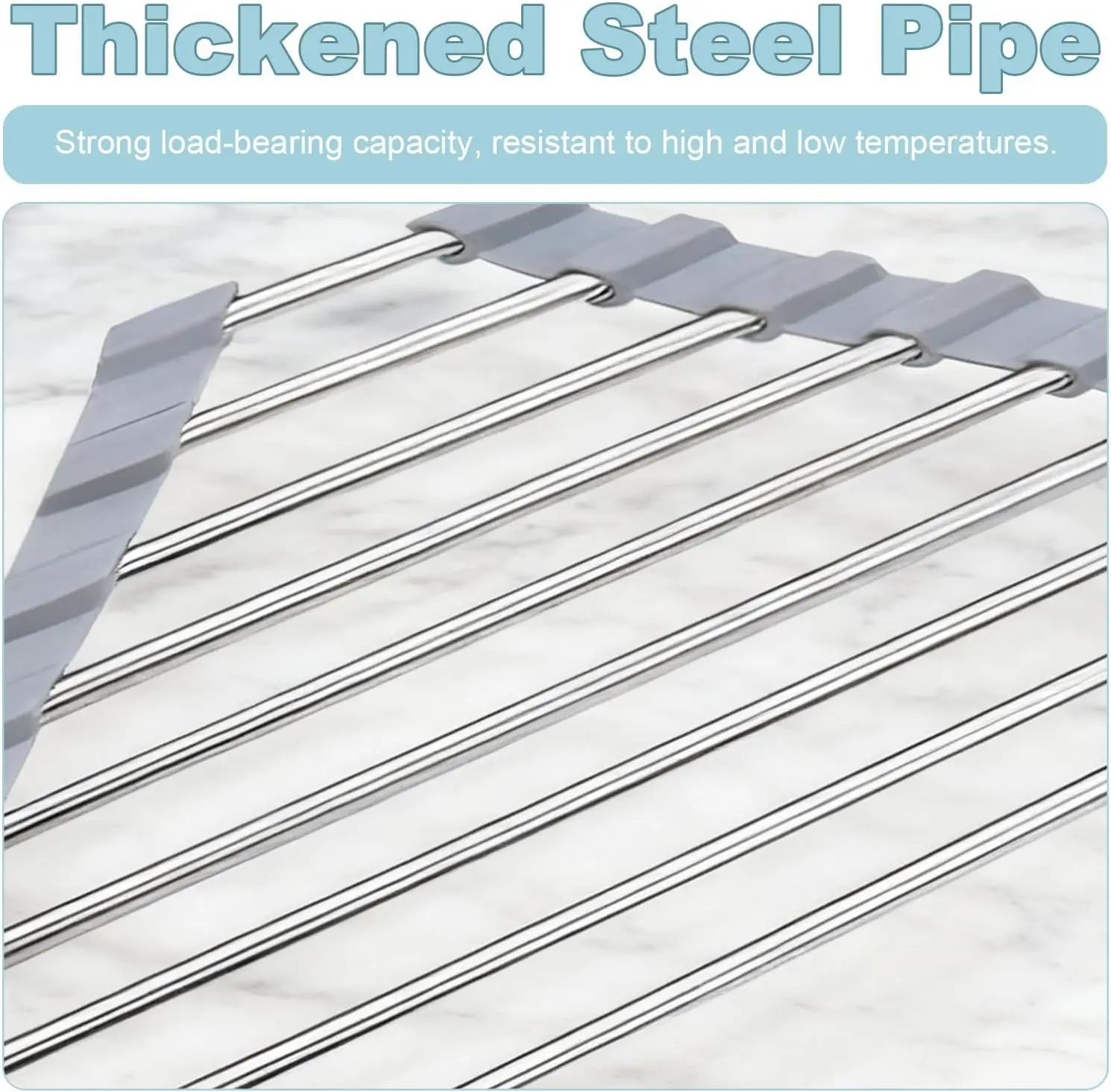 ·FITS MOST STANDARD KITCHEN SINKS: Crafted with 9 rust-proof stainless steel pipes embedded in silicone, this triangular dish rack for kitchen counter lies flat over sink corners without scratching surfaces. Its sturdy design withstands up to 11 pounds, while the silicone edges allow easy size customization—simply trim to fit smaller sinks.