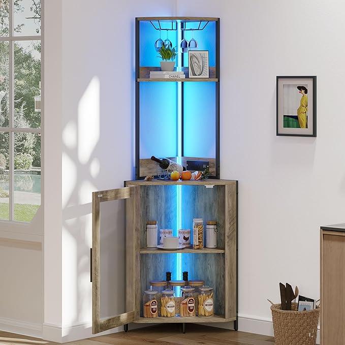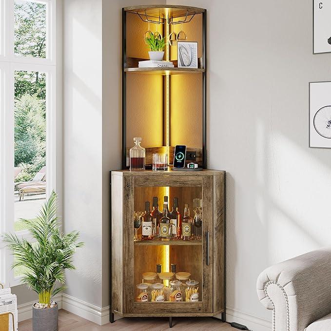 Generous Storage: This corner bar cabinet features three upper shelves, two rows of glass holders, and a bottom cabinet with a magnetic door. Plus, the adjustable shelf in the bottom cabinet offers three height options to accommodate various items
