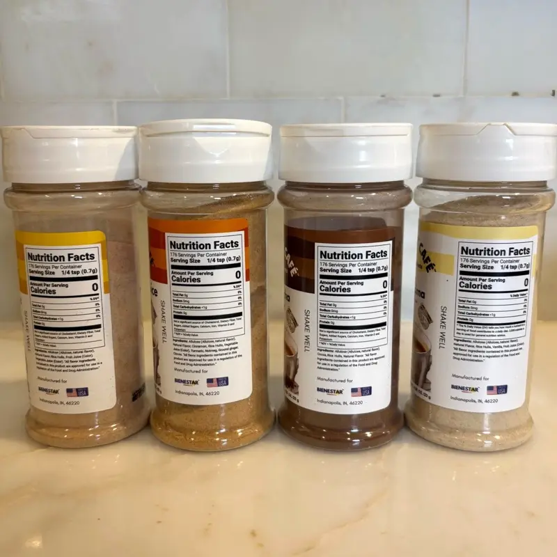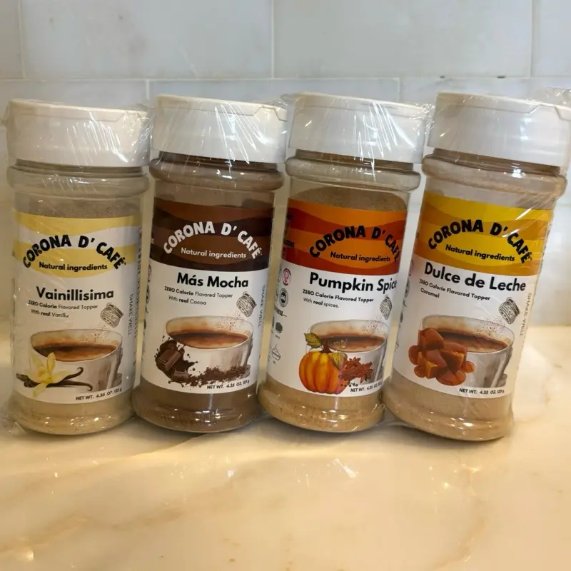 Bienestar Products’s favorite Corona D’Cafe flavors : Dulce De Leche, Vainillisima, Mas Mocha, and Pumpkin Spice. One (1) bottle of each flavor. 176 servings per container. Each flavor is ZERO calories and Zero Net Carbs per serving. Each shaker has a dual sift and pour top for easy application to use for all your beverage, food, and baking applications.