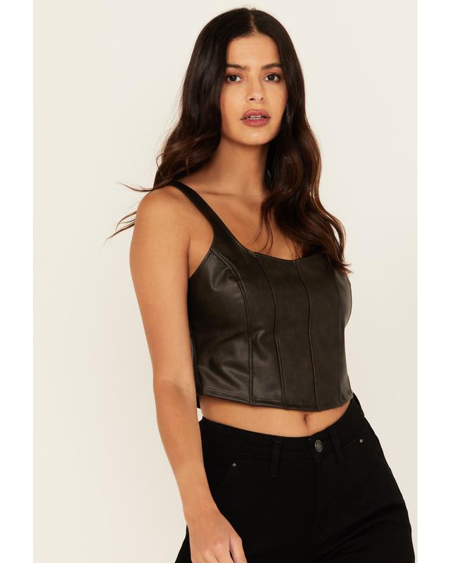 Model is 5'8" wearing a size small. 100% polyester. Faux leather upper. Sleeveless. Scoop neckline. Cropped styling. Solid black design. Made in the USA with globally sourced materials.