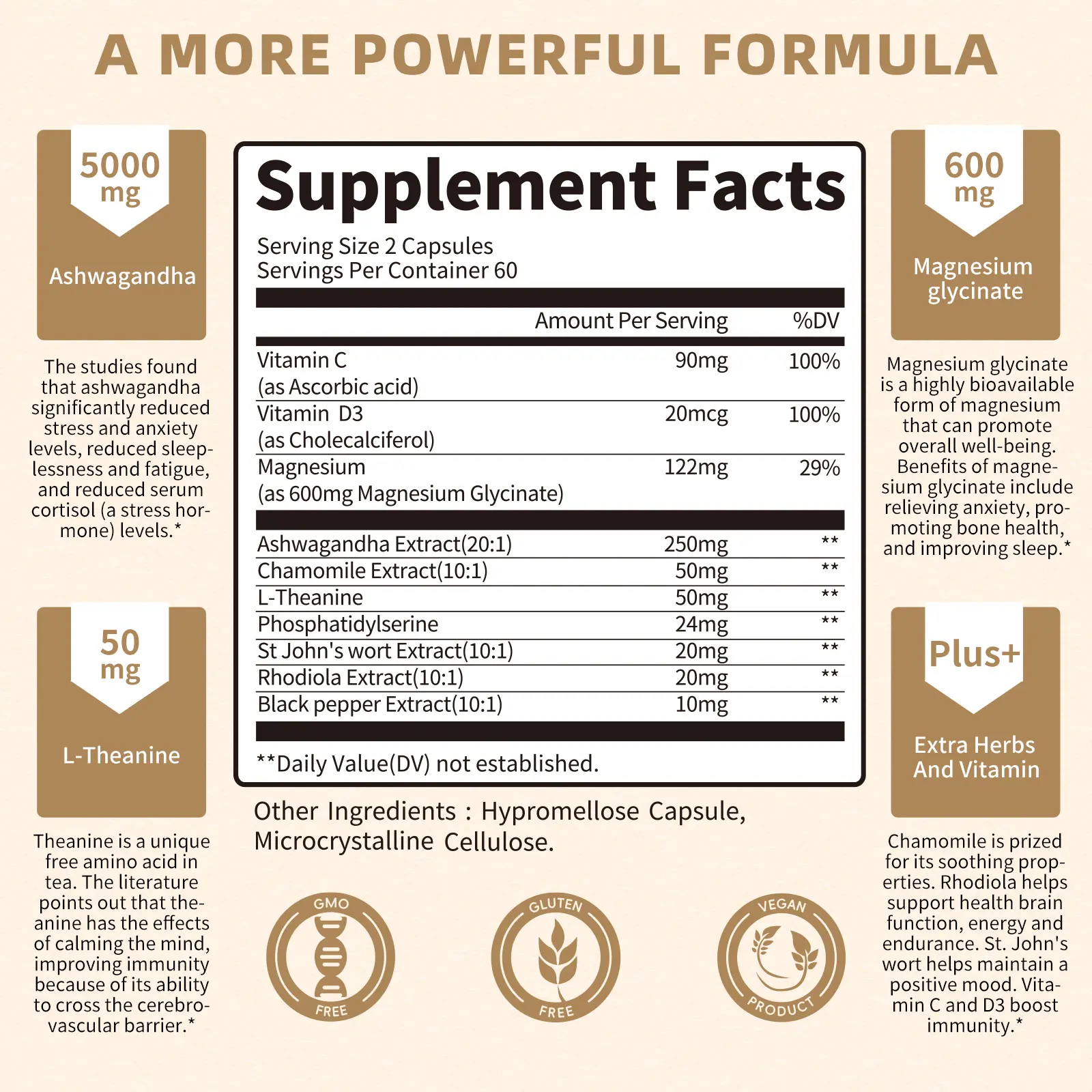 ·Ashwagandha 250 mg: Supports stress reduction.