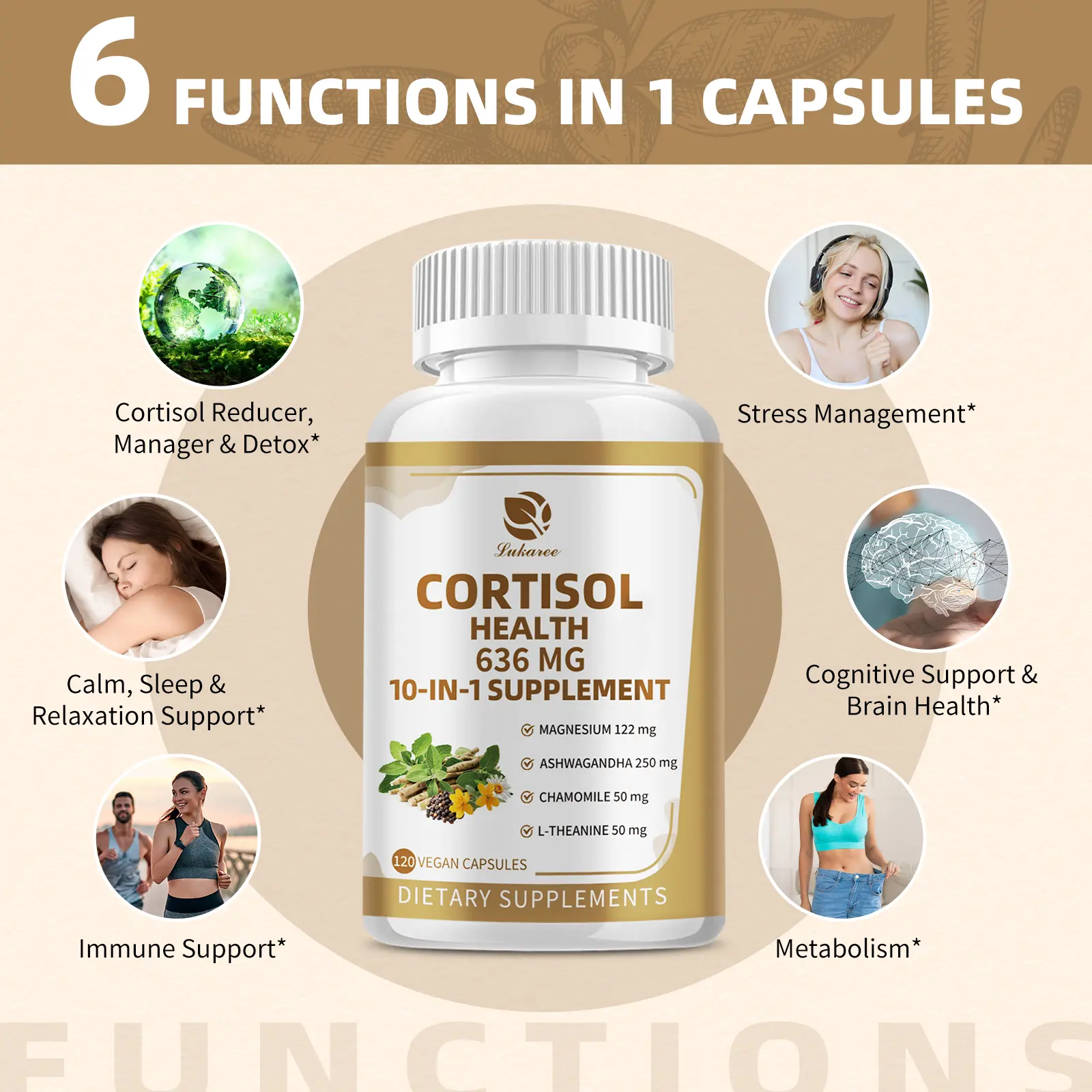 10-in-1 Cortisol Supplements with Magnesium, Ashwagandha, Chamomile, L-Theanine, St. John's Wort, Rhodiola, Vitamin C & D3, for Women Men, 120 Vegan Capsules.