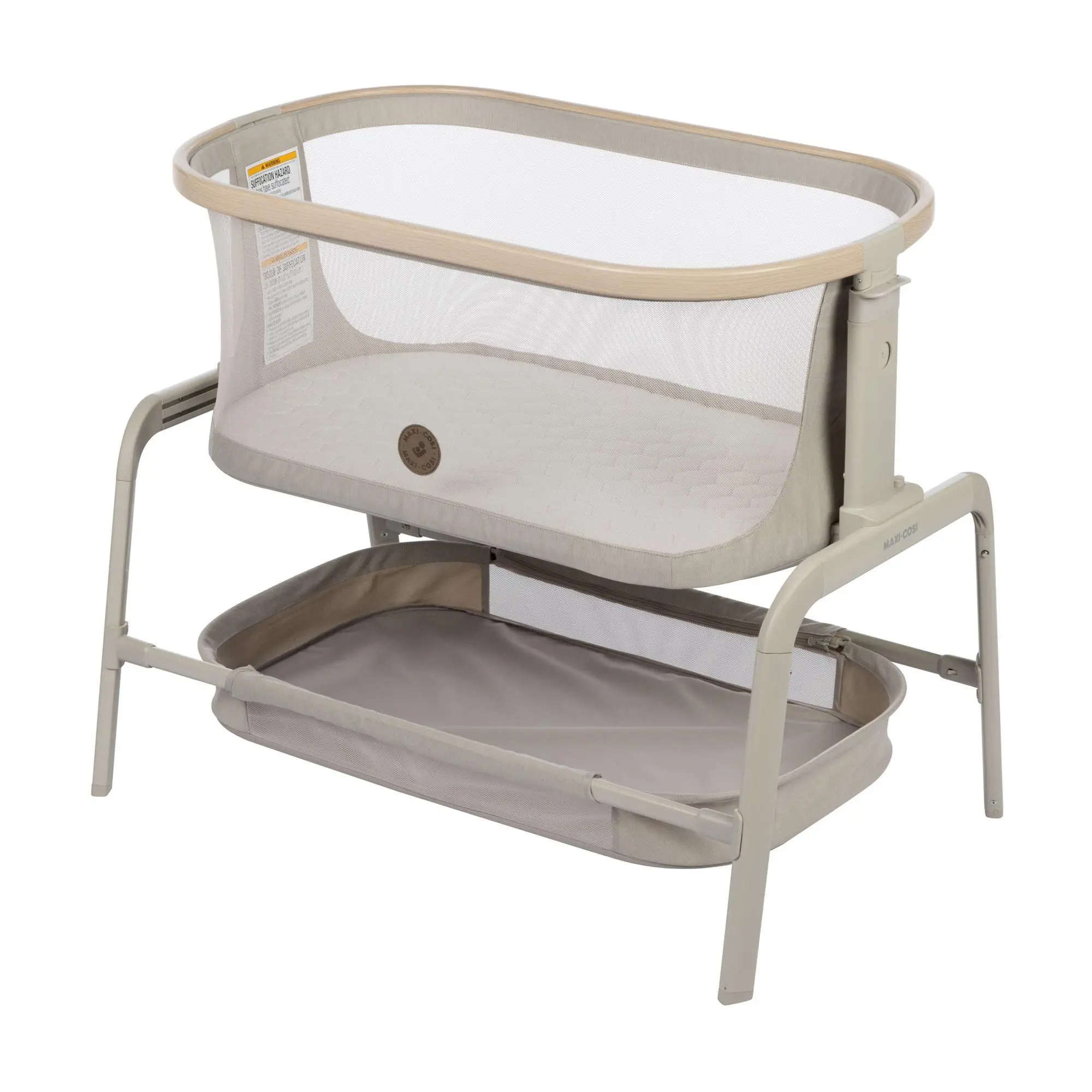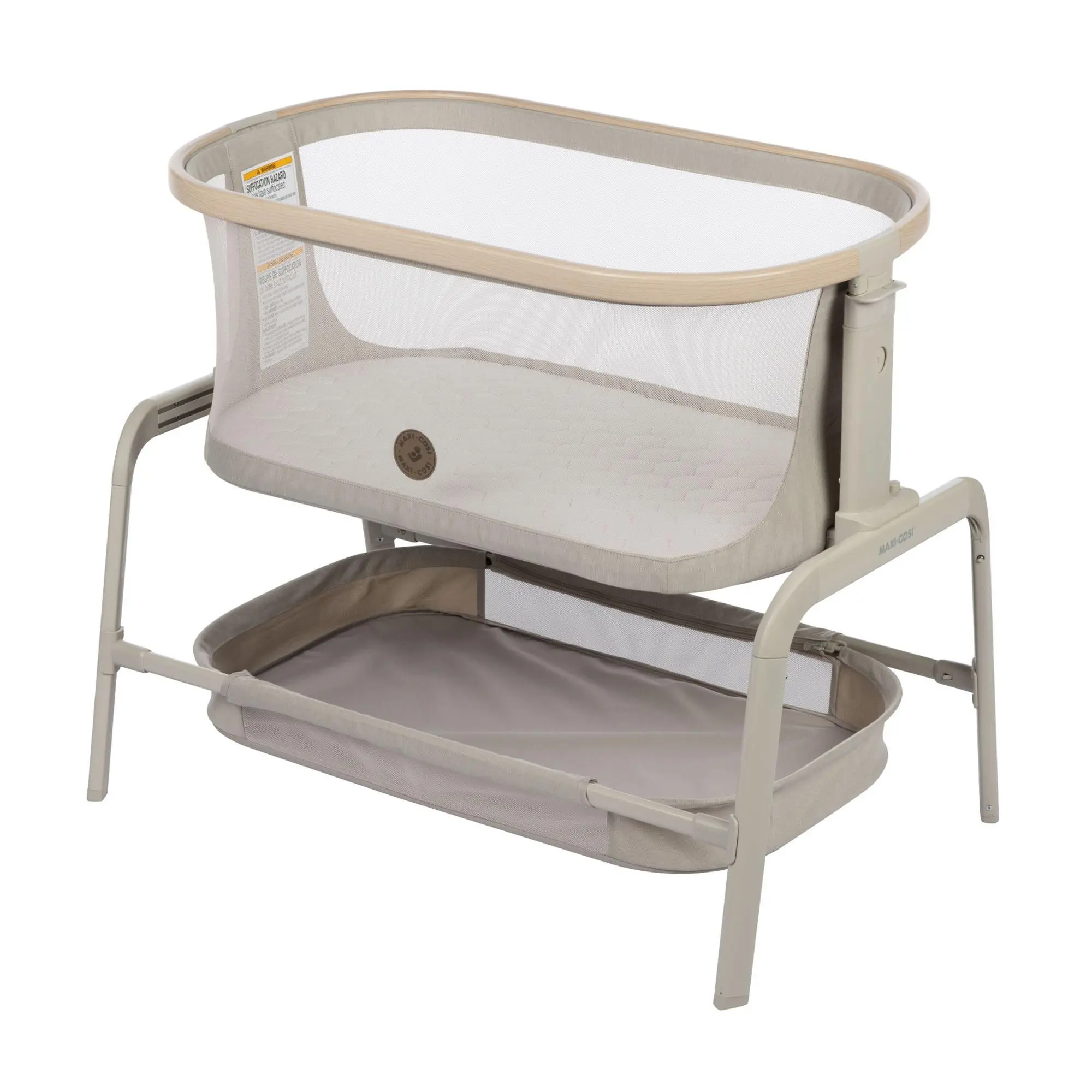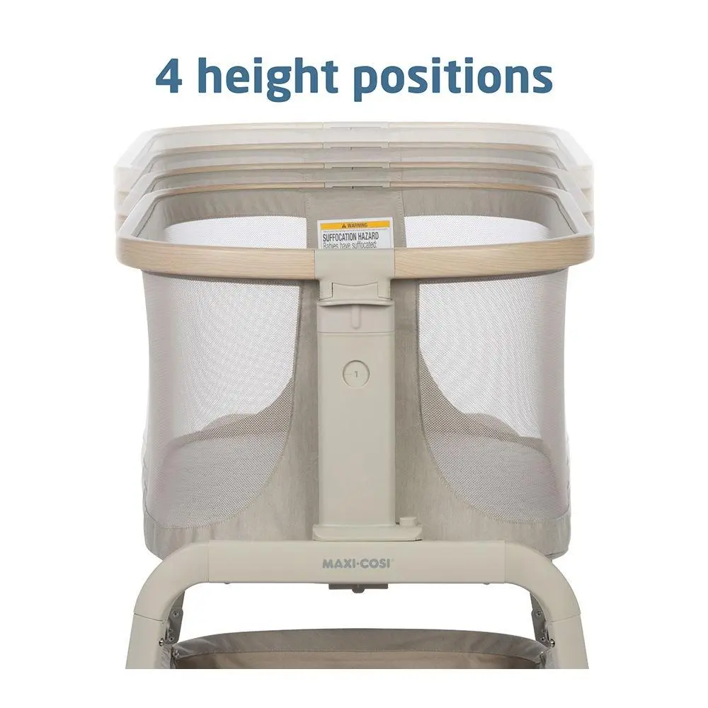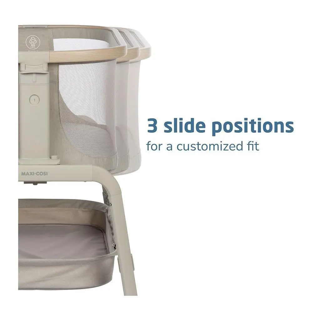 Experience peace of mind and convenience during those precious first months this bedside bassinet. The adjustable design and slide positions ensure the perfect fit next to your bed, making nighttime feedings and diaper changes a breeze. The spacious storage basket keeps essentials at hand, and the included travel bag makes it ideal for sleepovers. From Maxi-Cosi.