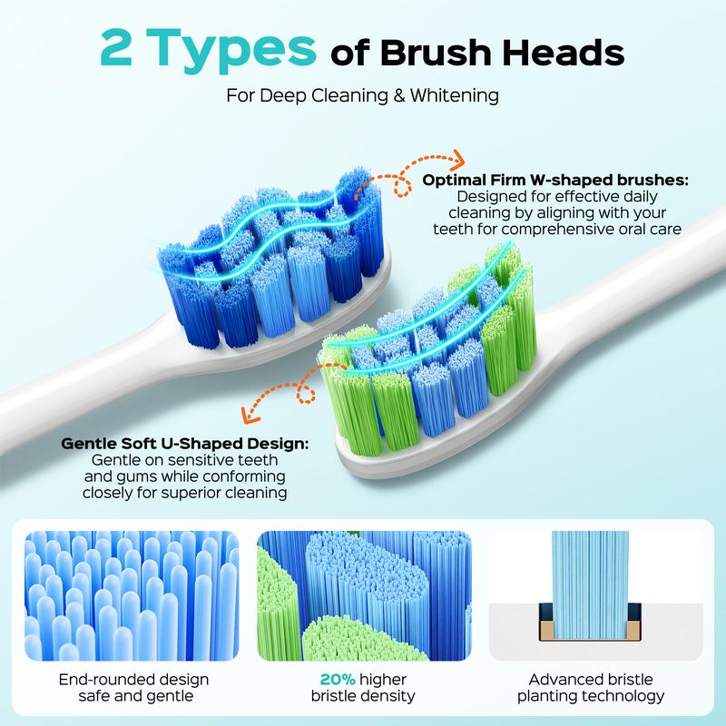 The set includes 2 W-shaped deep clean brush heads (0.7ml paste capacity) and 2 Crescent (U-shaped) clean brush heads (0.6ml paste capacity). The W-shaped heads align precisely with teeth for thorough, hard-to-reach cleaning, while the U-shaped heads wrap closely around tooth surfaces to enhance the whitening effect. Featuring selected US DuPont bristles, all end-rounded to ensure efficient cleaning while being safe and gentle on the gums. The high-density, rounded bristles safely protect both tooth enamel and gums.