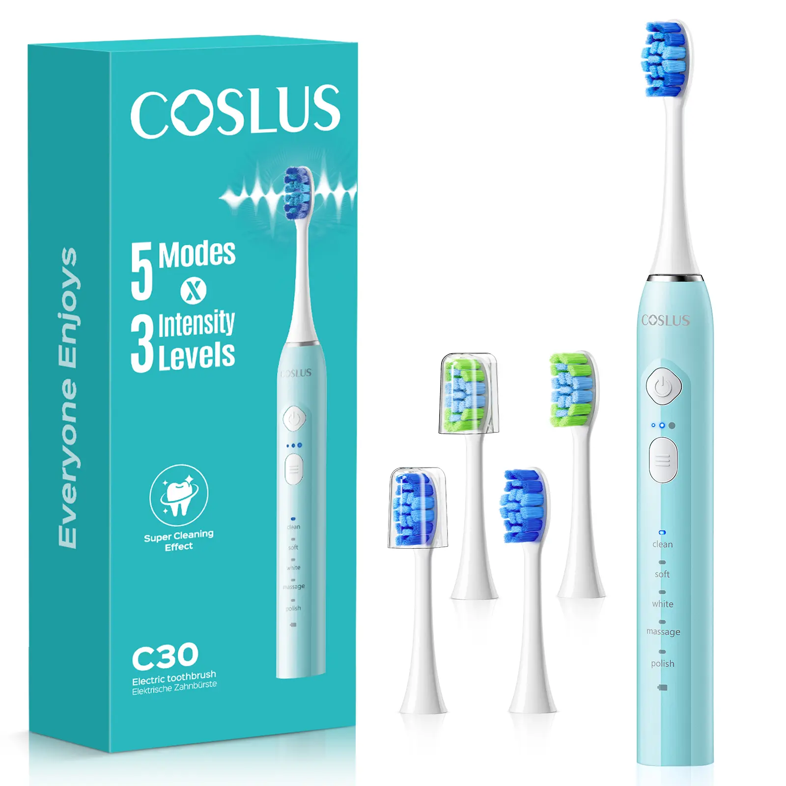 This COSLUS C30 Sonic Electric Toothbrush Offers 5 specialized modes - Clean, Soft, White, Massage, and Polish - each customizable with 3 adjustable intensity levels based on personal sensitivity. Whether it's for daily cleaning, caring for sensitive gums, teeth polishing and whitening, or stimulating gum blood circulation, it meets diverse needs and provides personalized care for users' oral health.