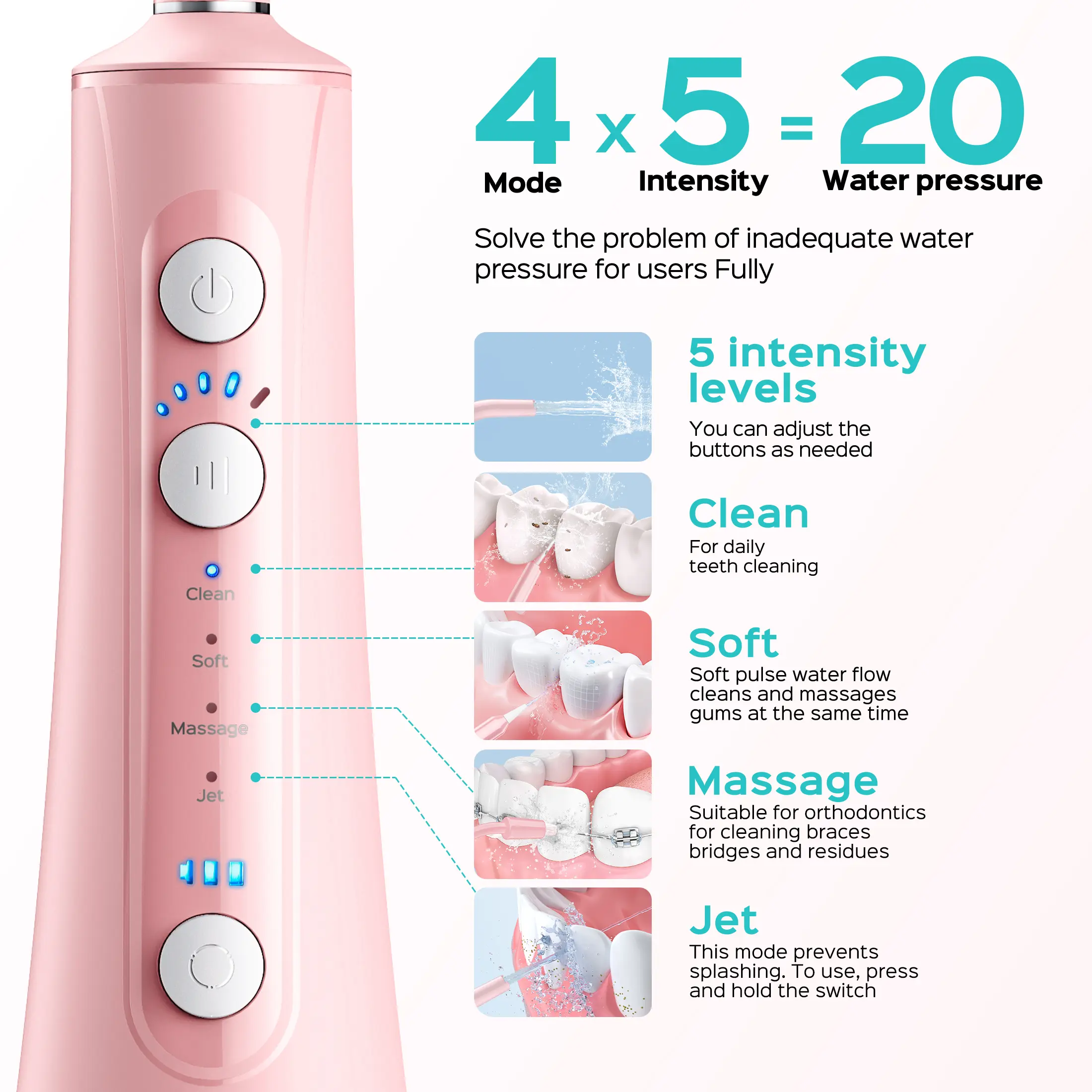 With 4 modes and 5 intensity levels, this COSLUS C50 water flosser offers 20 personalized combinations—from a gentle gum massage to a deep clean around braces and between teeth. One intuitive button adapts to everyone in the family.