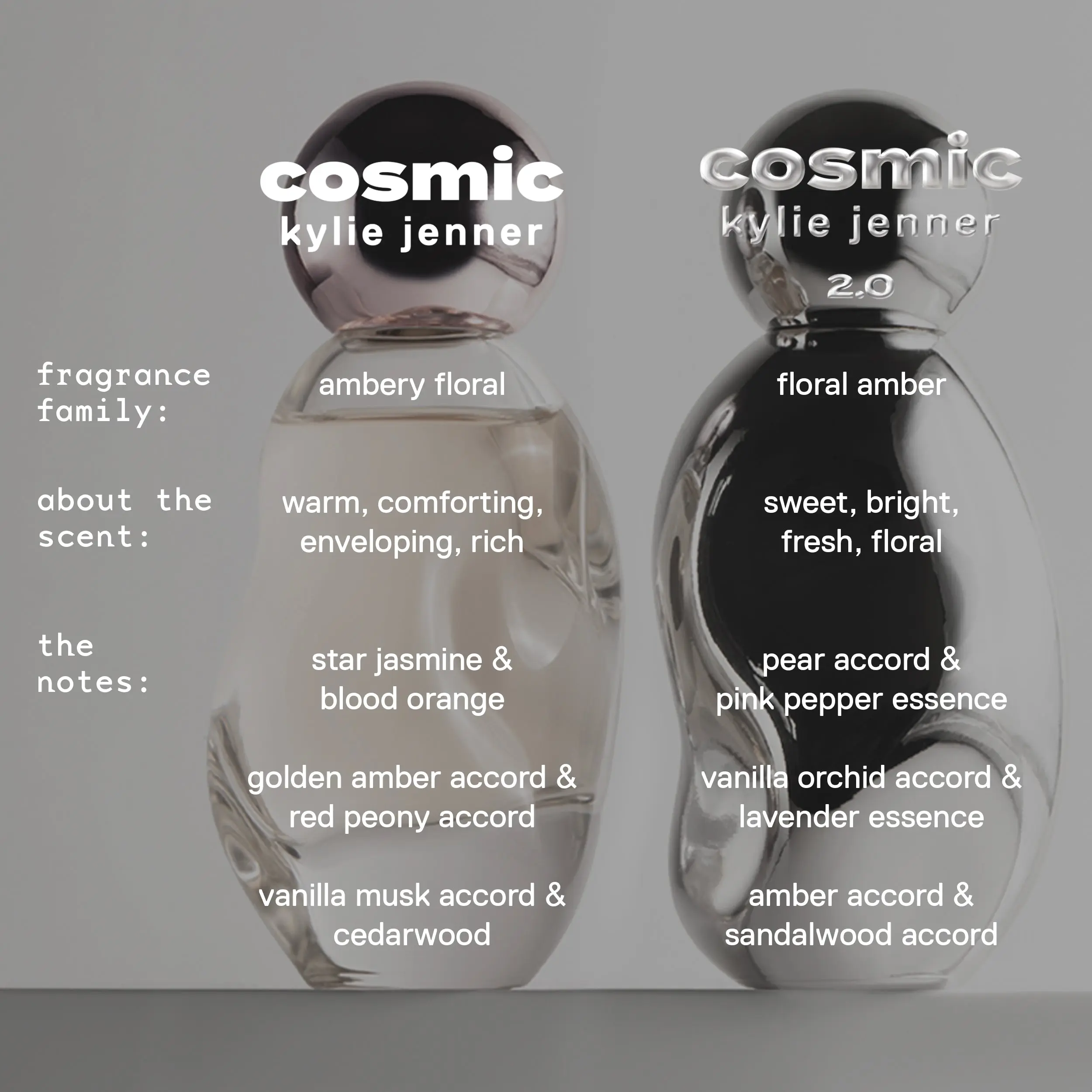 Experience the complete Cosmic Universe with a full-size Cosmic Kylie Jenner and 2.0. The original fragrance offers a sweet, warm, and elevated ambery floral allure, while 2.0 captures the feeling of a new day with fresh, bright notes of pear and pink pepper, alongside the familiar warmth of amber and vanilla.