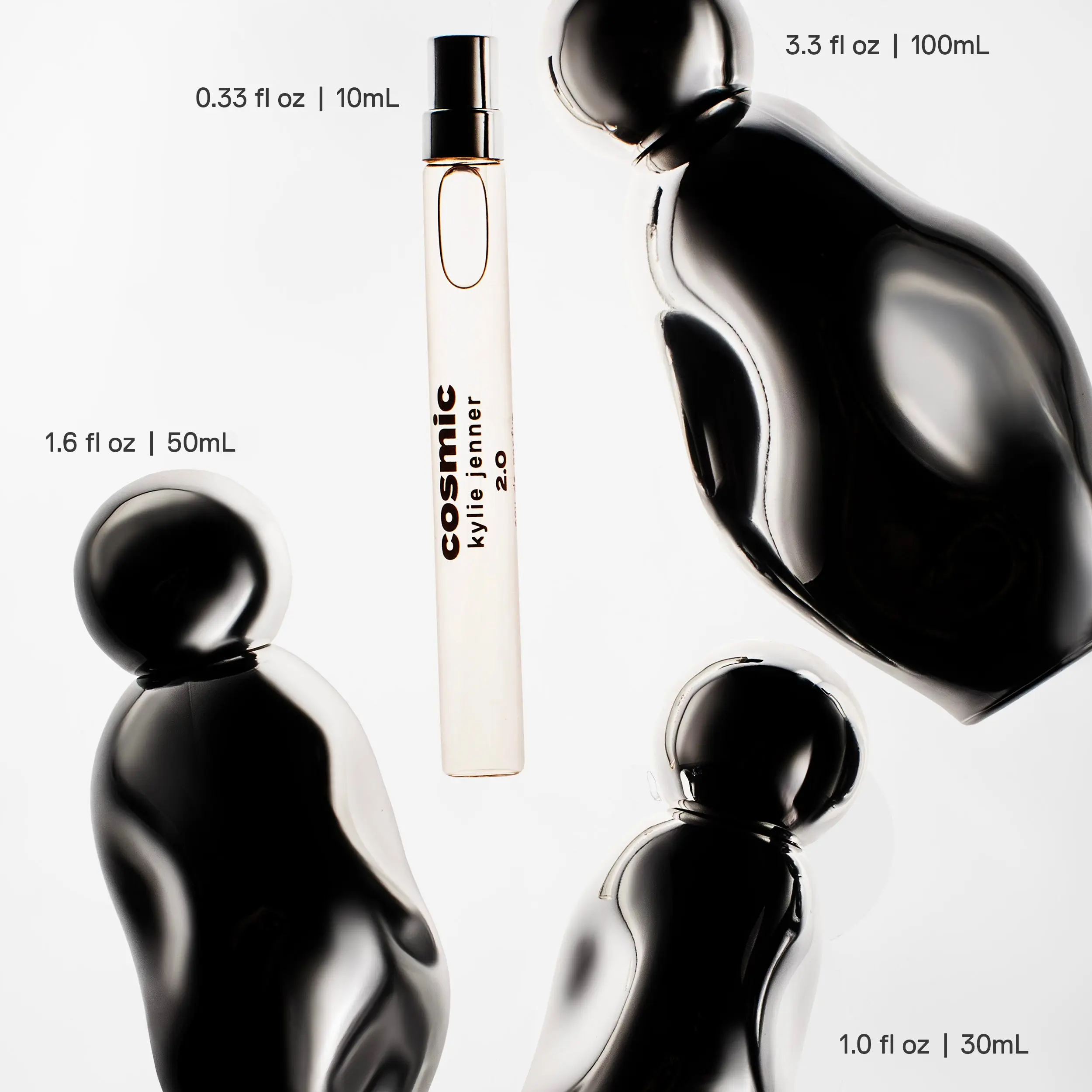 Embody the essence of dawn with the second fragrance in the Cosmic Universe. Cosmic Kylie Jenner 2.0, the floral amber sister to the original Cosmic, envelops you in fresh, bright, and sweet notes grounded in a warm amber base. This captivating fragrance is housed in a chrome edition of our original sculptural bottle and is formed to fit perfectly in the palm of your hand.