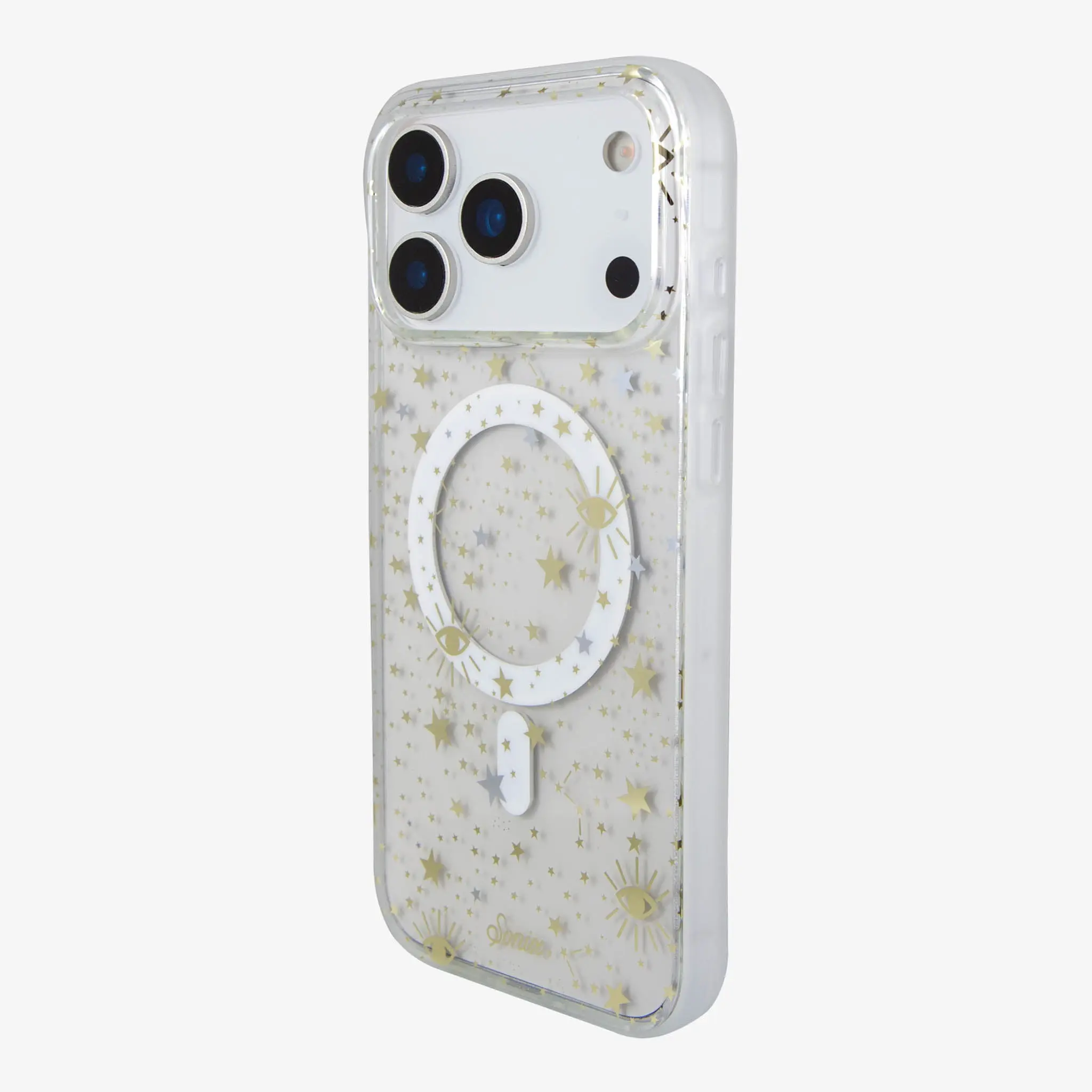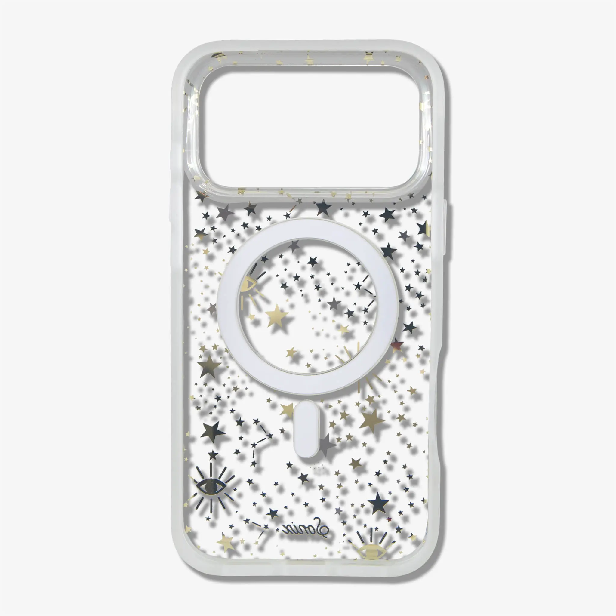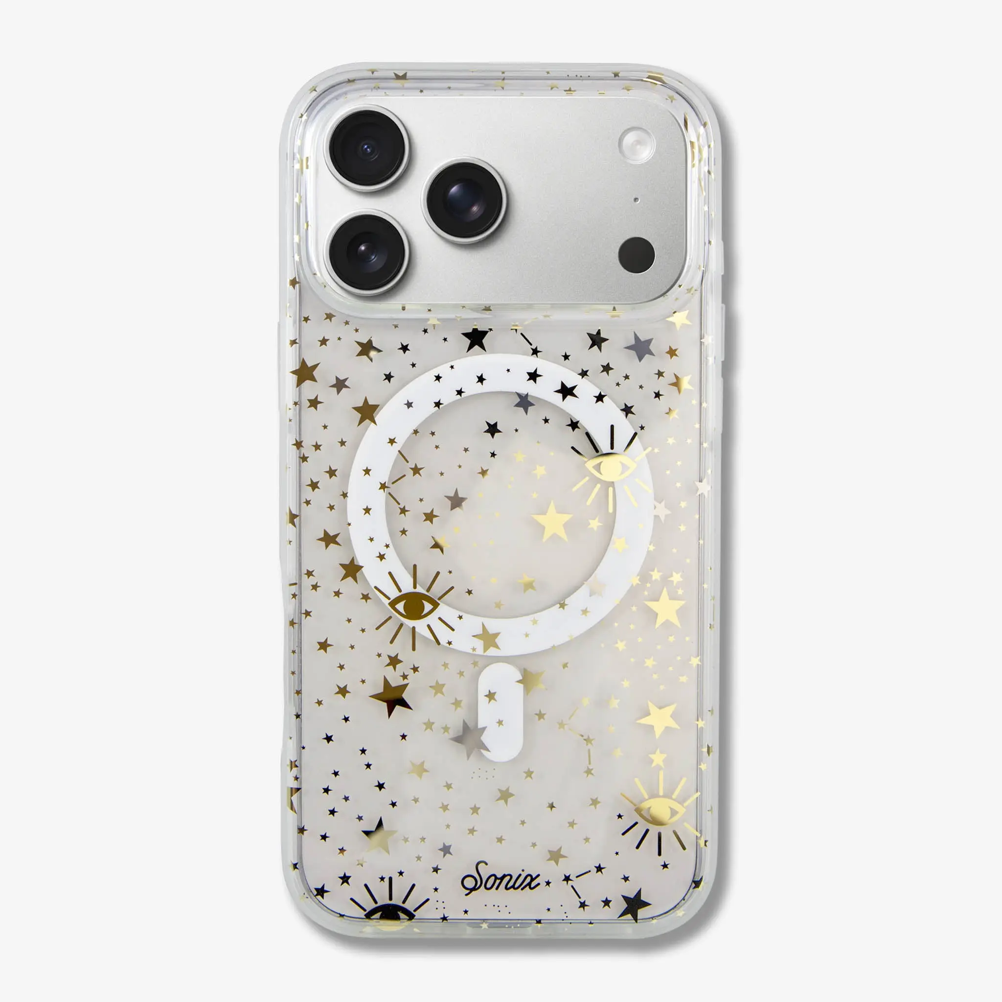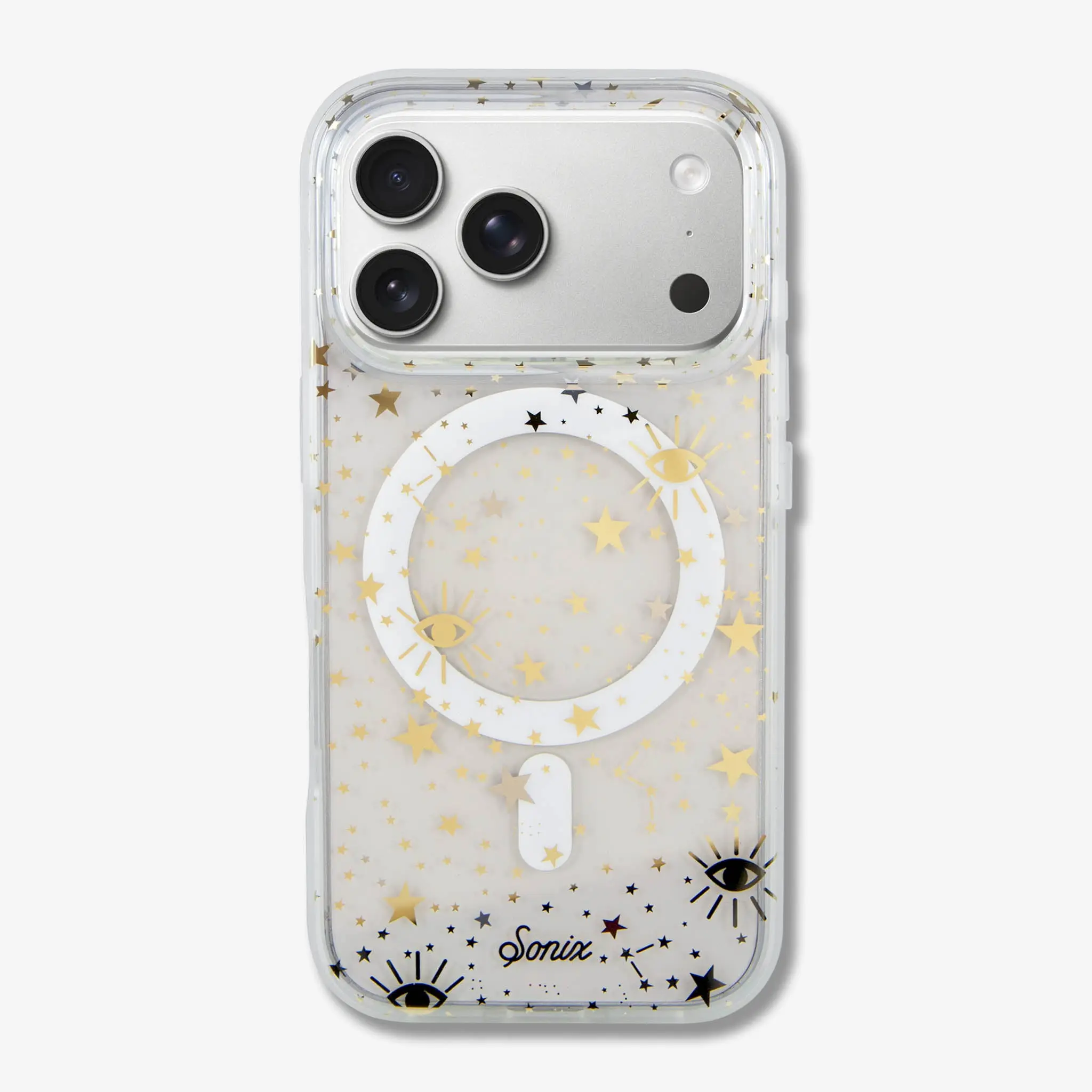 The universe is in the palm of your hand with our Cosmic MagSafe® Compatible iPhone case. Gold and silver stars expand across a clear case that incorporates the color of your phone into the backdrop of infinity. Gold foil cosmic eyes, a symbol of creativity and wisdom, provide the perfect accent to a case that showcases the simple beauty of abundance.