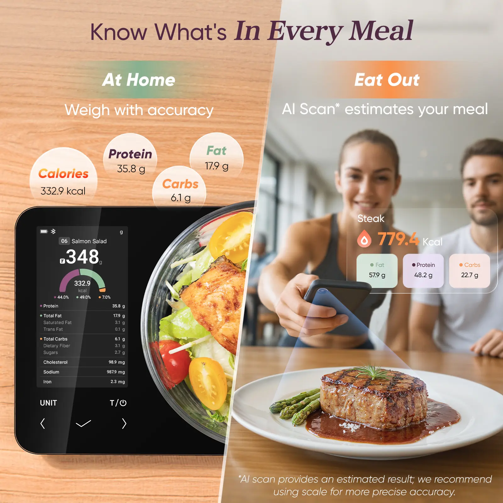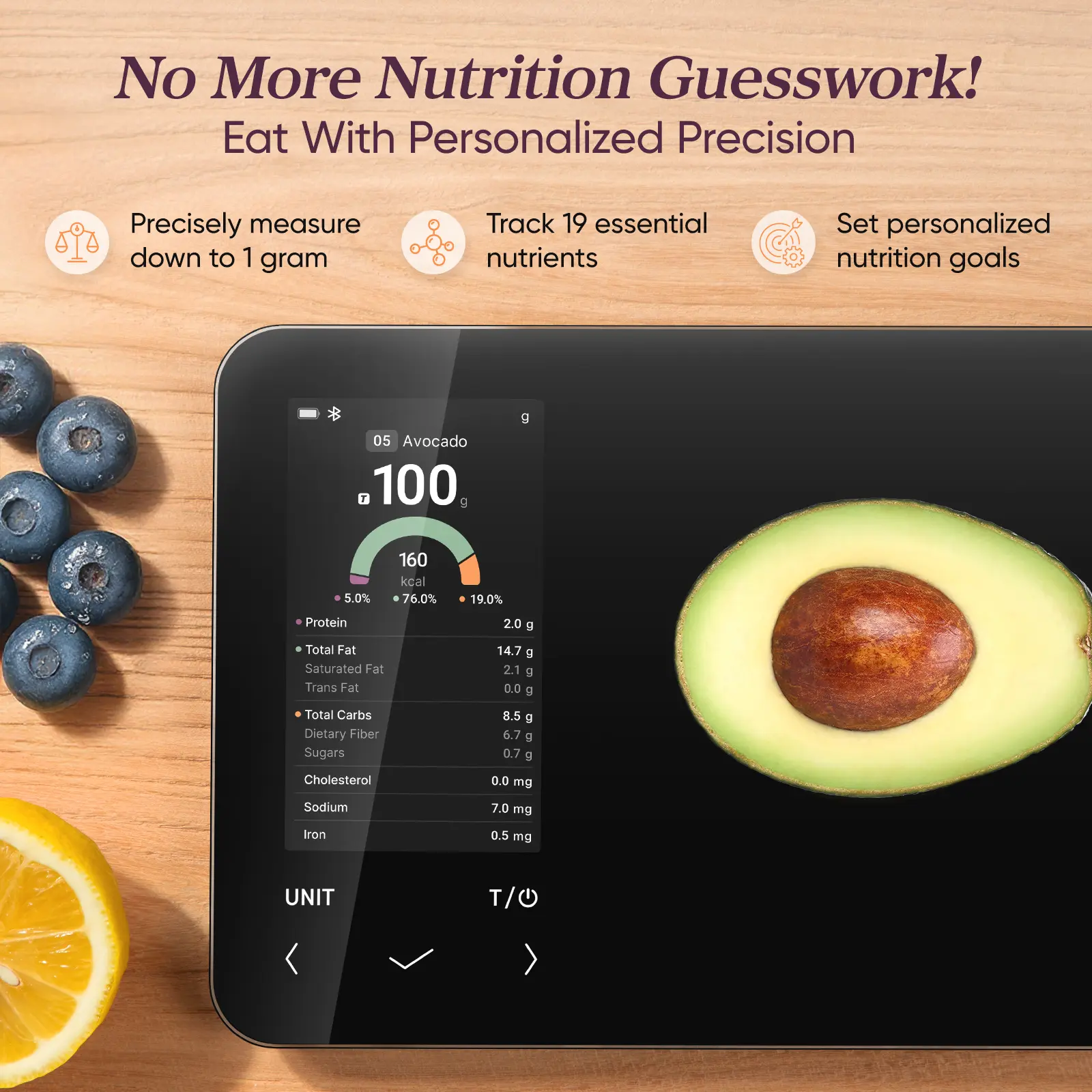 Eliminate nutrition guesswork and reach your goals with the advanced COSORI Smart Nutrition Scale. Accurately weigh and view key data on 19 essential nutrients including calories, protein, carbs, and fat using a database of over 1 million foods. Achieve perfect portion control: weigh foods from 3 to 5,000 grams in precise 1-gram increments, with easy switching between 7 measuring units.