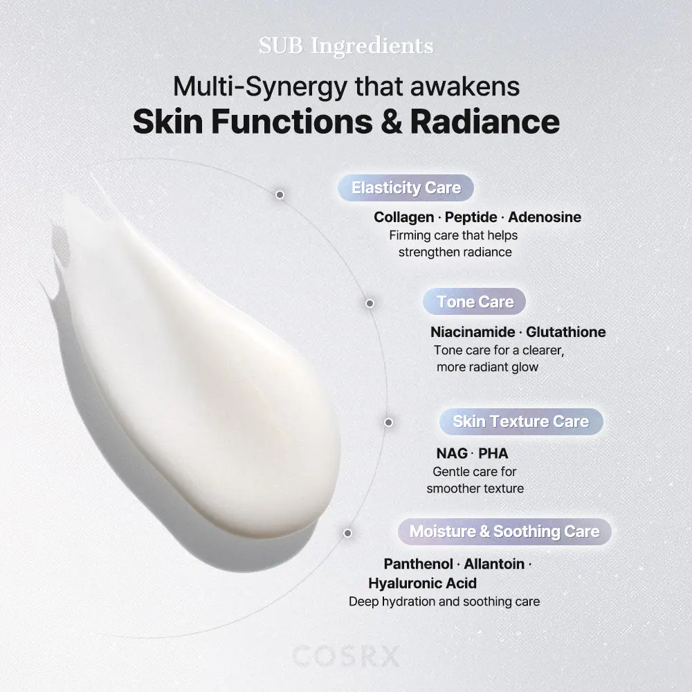 Aqua/Water, Polyvinyl Alcohol, Octyldodecanol, Methylpropanediol, Butylene Glycol, Niacinamide, Caprylic/Capric Triglyceride, 1,2-Hexanediol, Algin, Polysorbate 80, Pentaerythrityl Tetraethylhexanoate, Pullulan, Simmondsia Chinensis (Jojoba) Seed Oil, Polyglyceryl-10 Oleate, Glyceryl Stearate, PEG-100 Stearate, Titanium Dioxide, Disteardimonium Hectorite, Synthetic Fluorphlogopite, Mica, Microcrystalline Cellulose, Ethylhexylglycerin, Sphingomonas Ferment Extract, Adenosine, Cellulose Gum, Sodium Phytate, Sodium DNA, Tin Oxide, Glutathione, Acetyl Glucosamine, Allantoin, Panthenol, Hydrolyzed Collagen, Gluconolactone, Mannitol, Centella Asiatica Leaf Extract, Glycerin, Lactobacillus Extracellular Vesicles, Hydrated Silica, Citric Acid, Sodium Hyaluronate, Caprylyl Glycol, Acetyl Hexapeptide-8