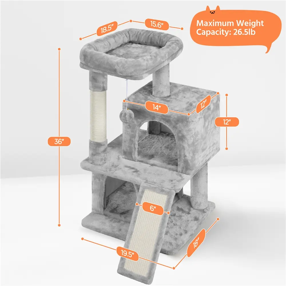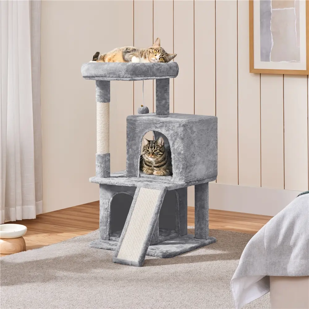 Its vertical three-level design integrates a high-edged plush perch, two enclosed condos with dual doors, a sisal scratching post, and a separate scratching board. This layout offers a comprehensive space for climbing, playing, scratching, and cozy resting.