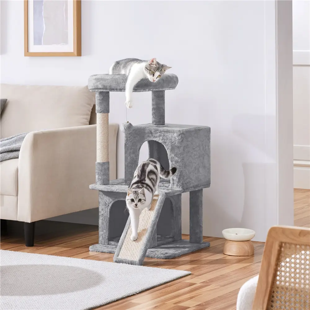 This multi-level plush cat tree features sturdy, long-lasting construction with E1-compliant particleboard, metal, natural sisal rope and soft plush fabric, serving as both a fun playground and a cozy resting spot for your feline friends. The elevated perch with raised edges is a perfect lounging nook, while two enclosed condos offer secure, quiet spaces for napping—each condo comes with double doors for easy access. A sisal-wrapped scratching post and a dedicated scratching board give cats a great place to play and stretch, effectively protecting your furniture from unwanted scratches.