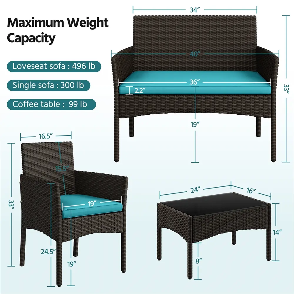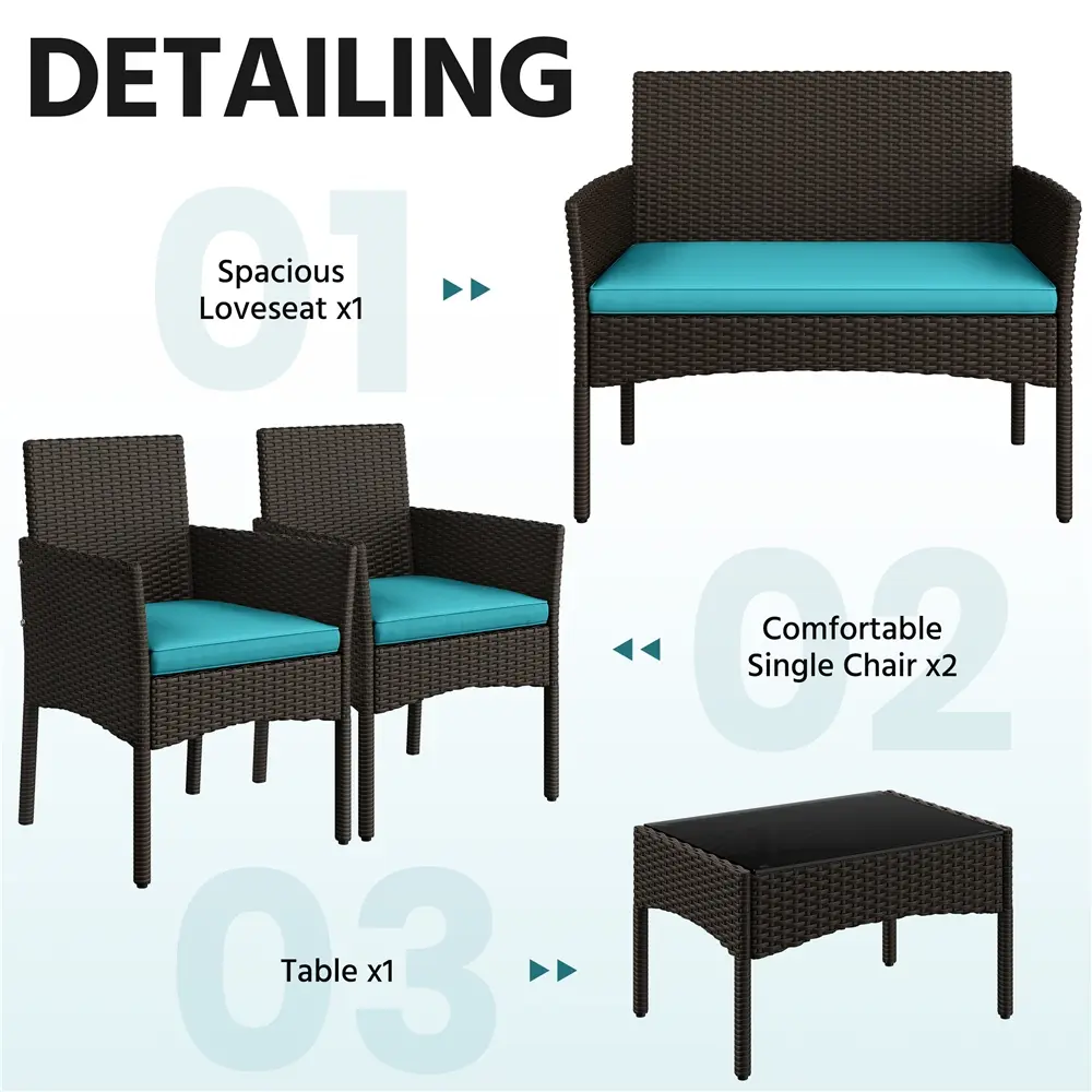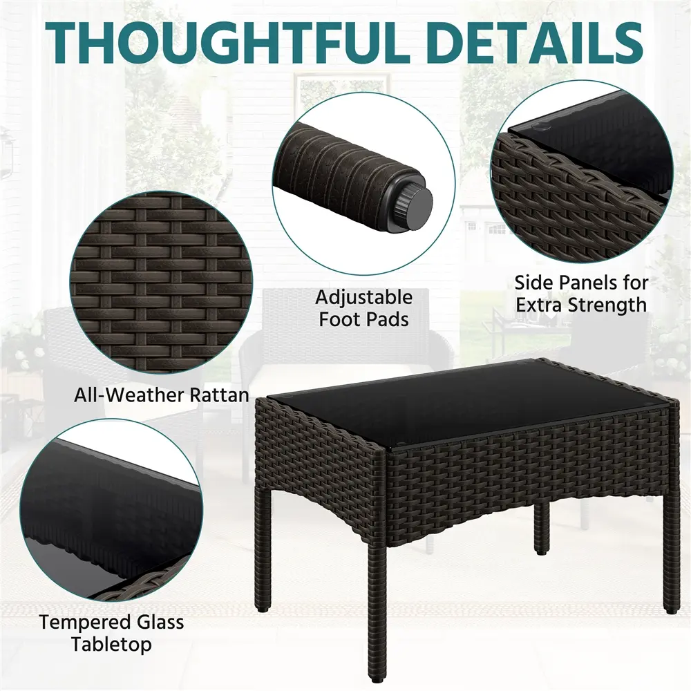 This garden suite uses PE rattan, known for its durability and weather resistance. The hand-woven technique showcases natural authenticity and exquisite craftsmanship. The set is ideal for backyard, garden, or deck use. It provides a natural vibe that seamlessly integrates into your outdoor living space.