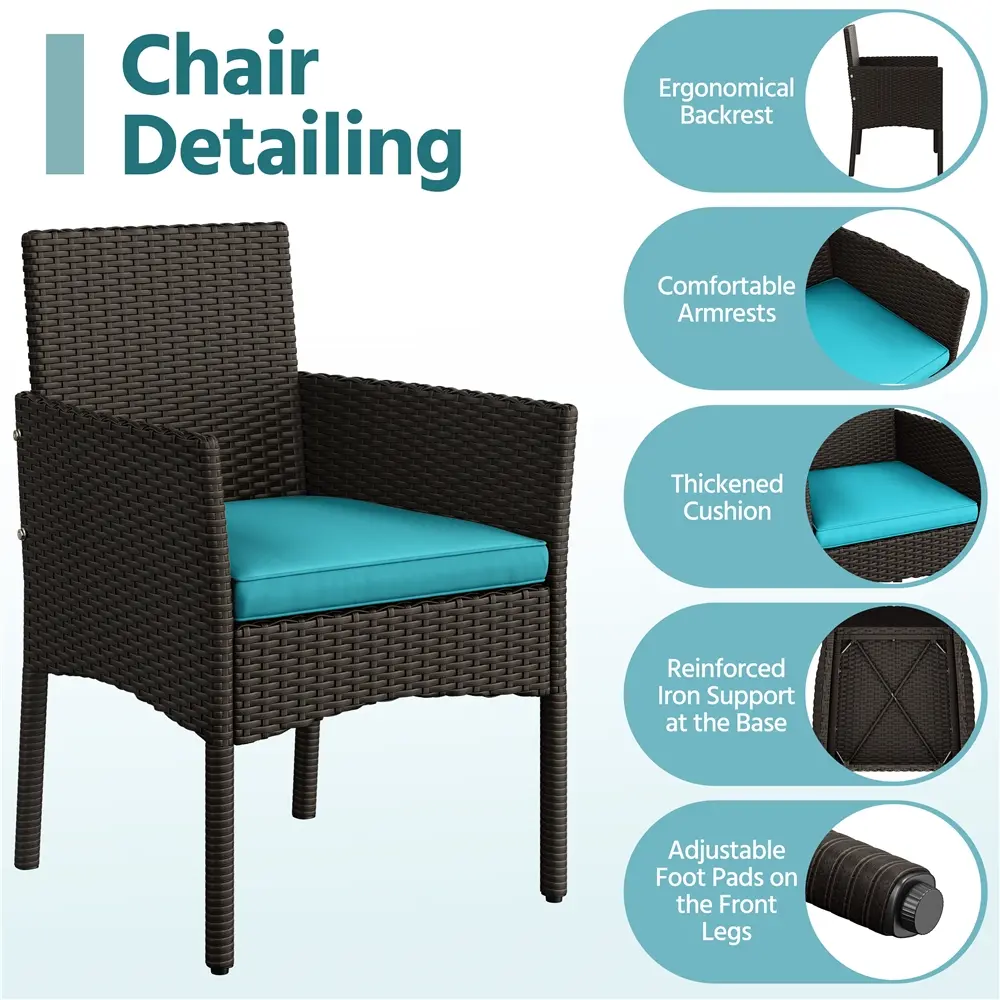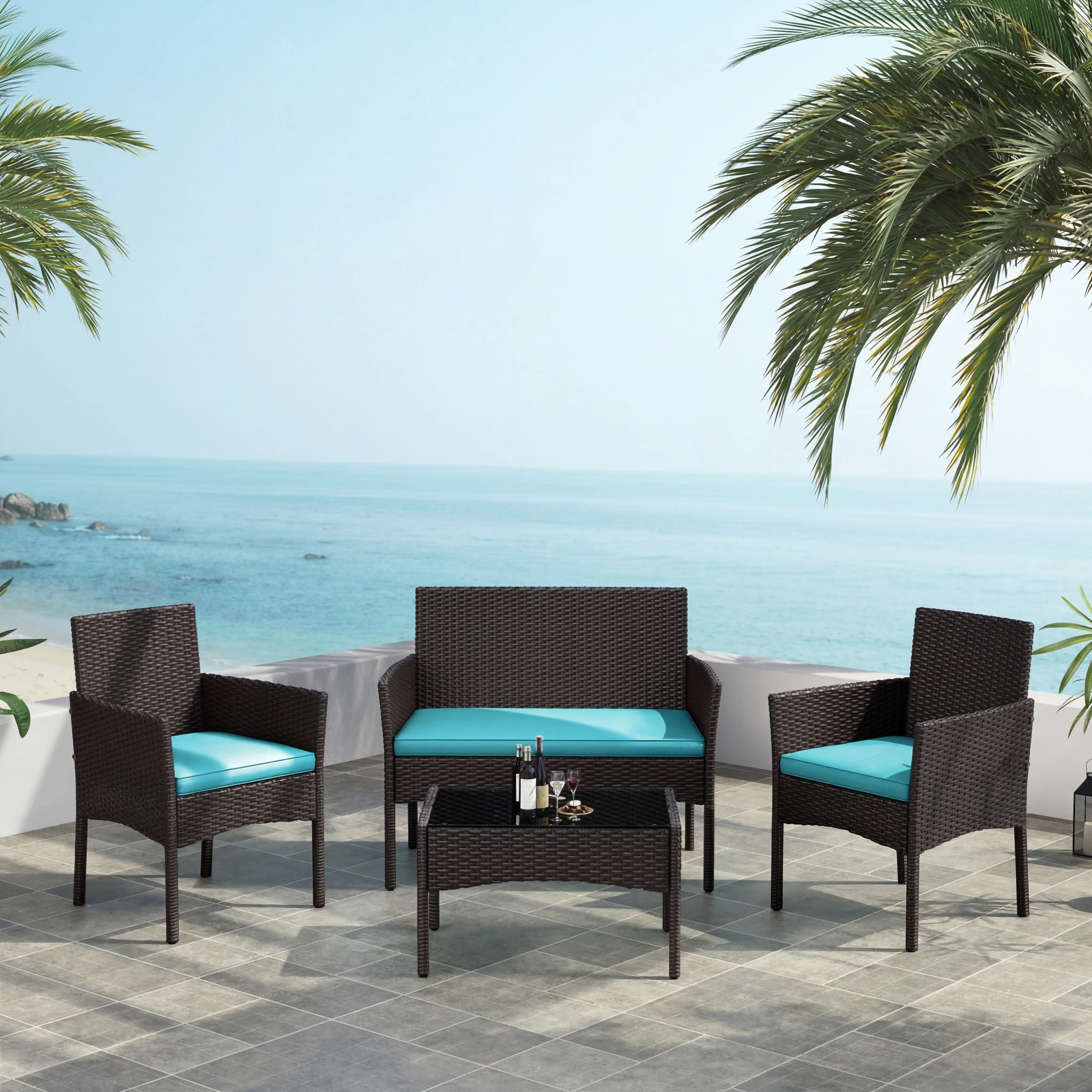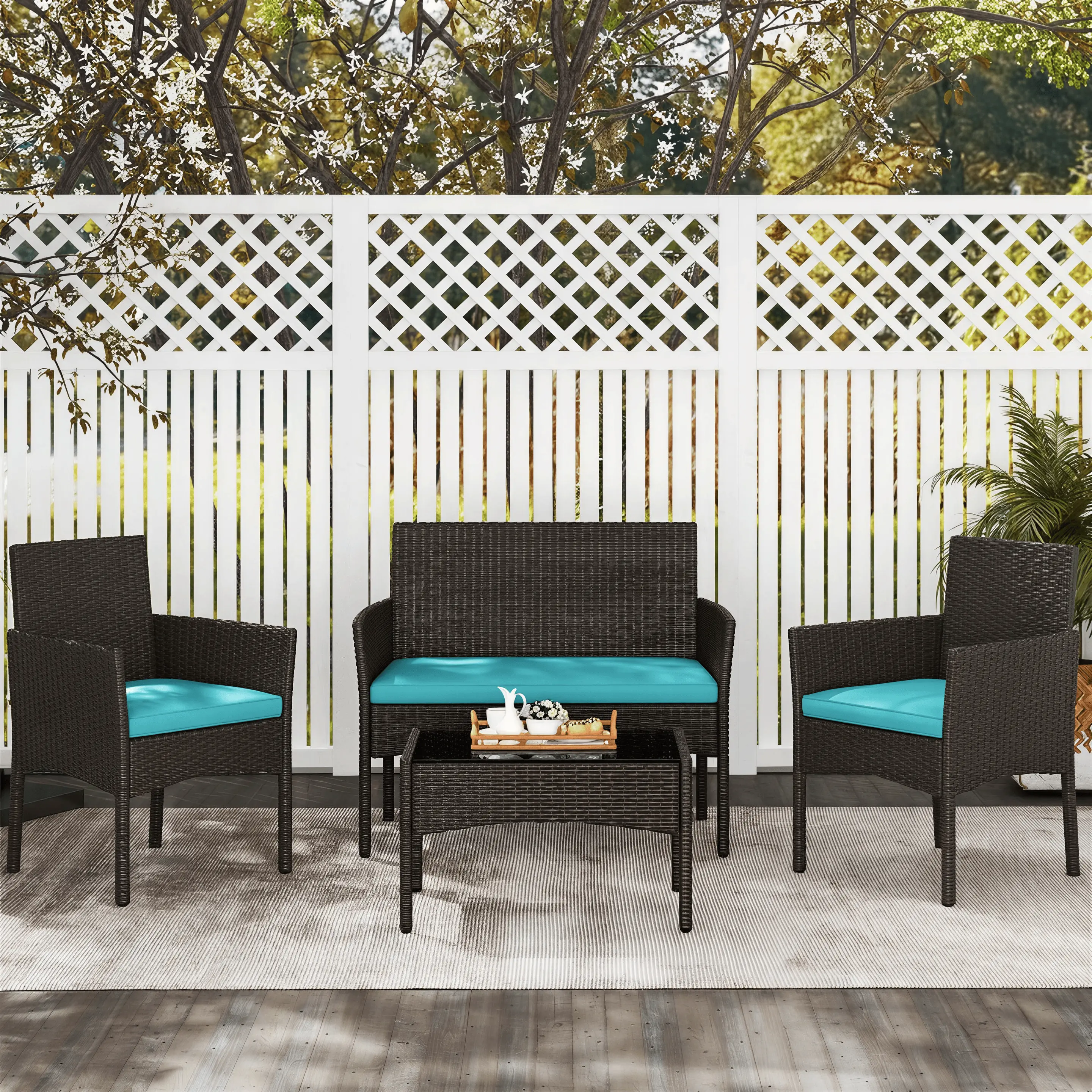 This garden suite uses PE rattan, known for its durability and weather resistance. The hand-woven technique showcases natural authenticity and exquisite craftsmanship. The set is ideal for backyard, garden, or deck use. It provides a natural vibe that seamlessly integrates into your outdoor living space.