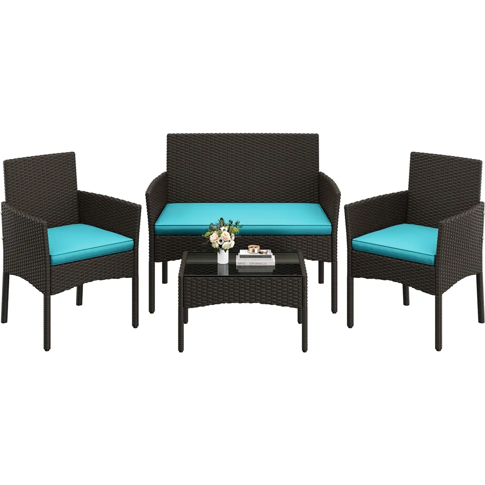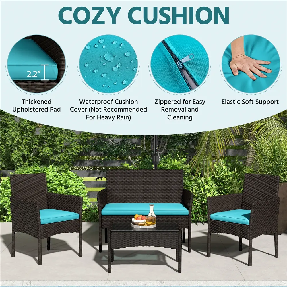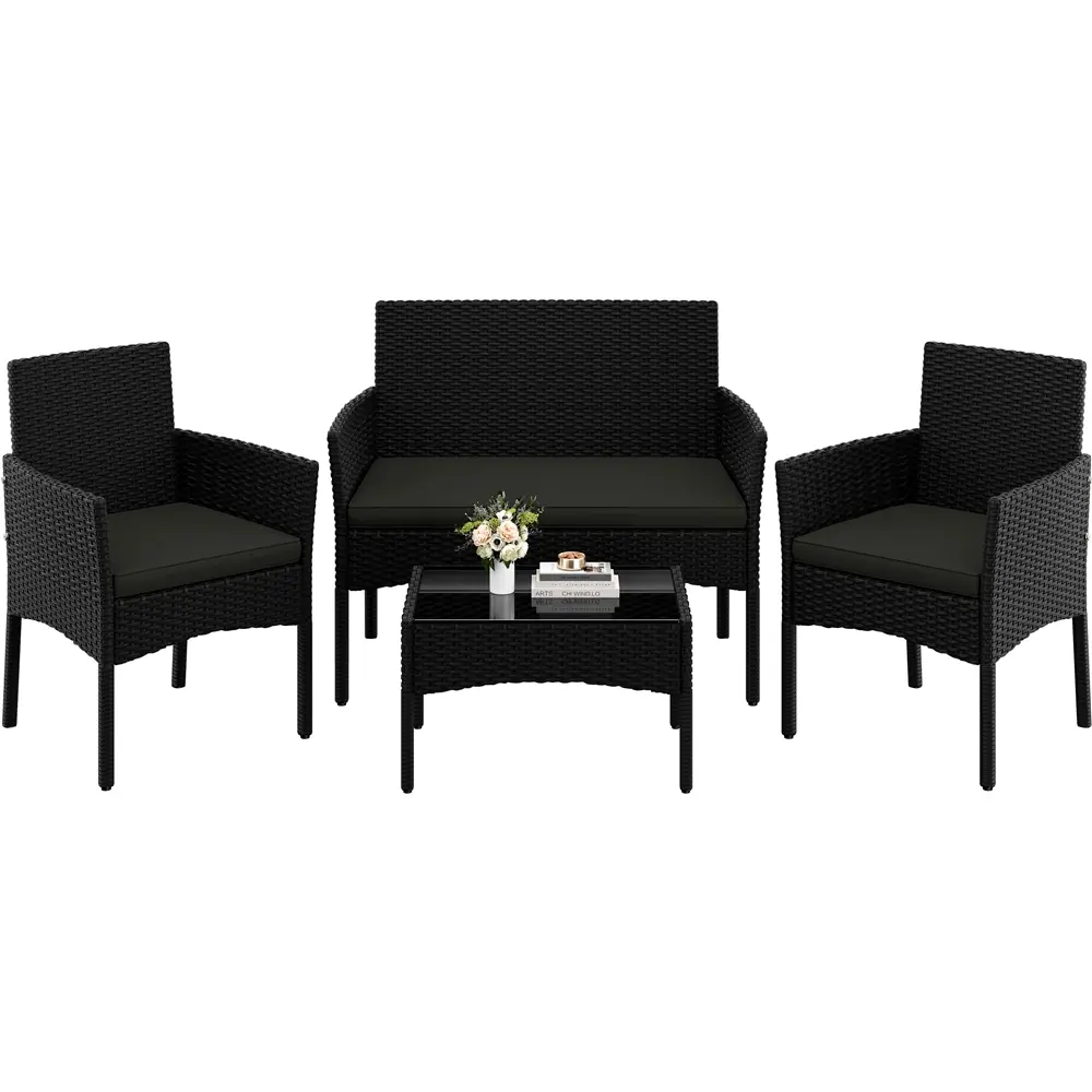 Upgrade your outdoor area with this 4-piece garden set. It includes a loveseat, two single sofas, and a coffee table, all made from durable hand-woven PE rattan. The thick foam cushions and ergonomic backs ensure comfort. The tempered glass tabletop adds a sleek finish. Perfect for relaxing or socializing, this set combines style and practicality.