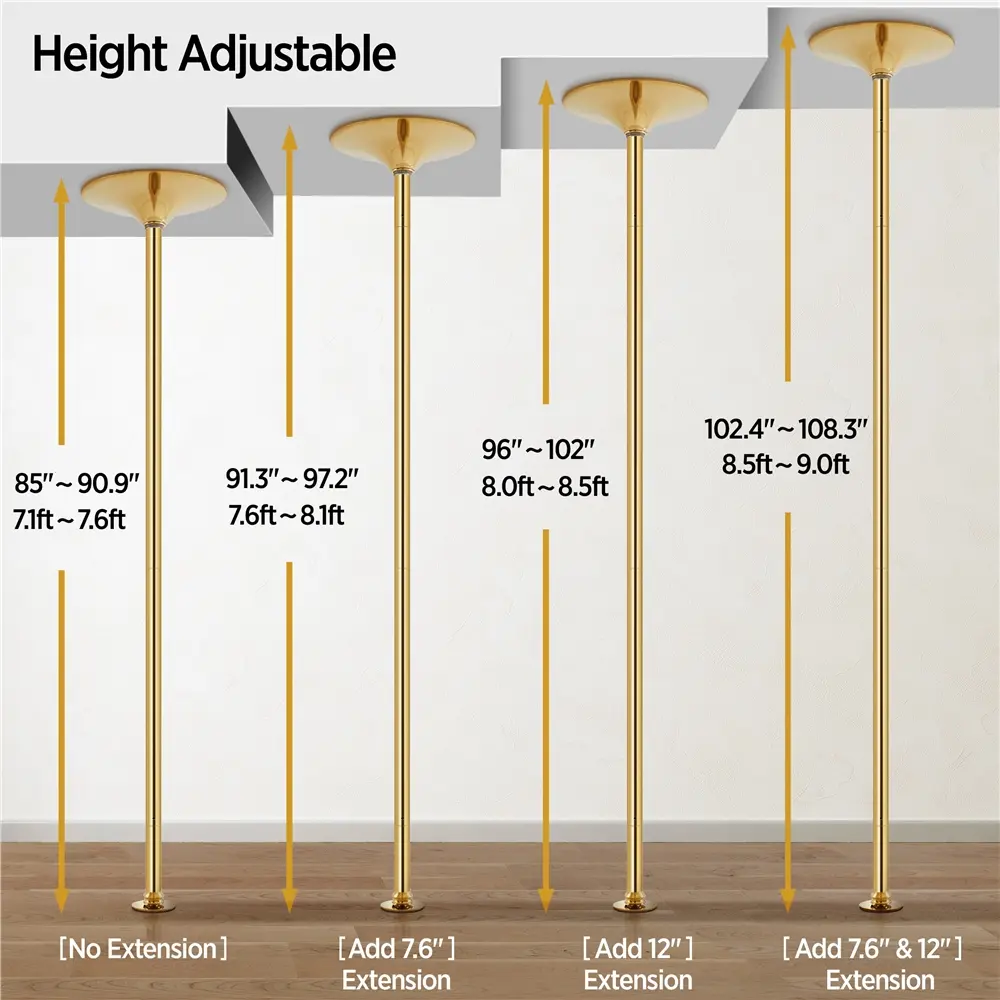 Pole dancing is a fantastic choice for indoor workouts—it torches calories fast, boosts metabolism, tones muscles, enhances balance and flexibility, and builds solid core strength. This home dance pole makes practice hassle-free for anyone too busy for studio classes; with a simple setup, you can squeeze in sessions right in your living room. It offers two modes (spinning and static) to help you master new tricks or add graceful flair to your movements. Plus, it comes with 3 extension sections, so you can adjust the height from 7’ (216cm) to 9’ (275cm) to fit different ceiling heights perfectly.