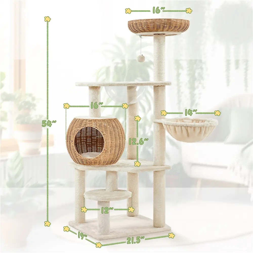 Give your feline friend the perfect blend of comfort, fun, and elegance with our 54" Rattan Cat Tree. Crafted from CARB P2-compliant engineered wood and durable PE rattan, it offers a sturdy, eco-conscious build that’s built to last—while its natural, earthy look effortlessly complements modern, boho, or minimalist interiors.