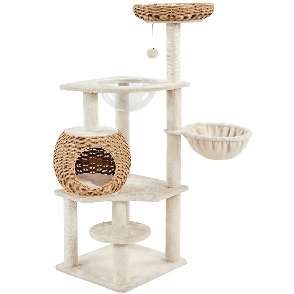 Features a top-round nest, enclosed condo, side basket, and a clear viewing bowl—giving your cat multiple cozy spots to nap, perch, or observe the world. Plus, a dangling bell ball keeps them entertained when you’re away!