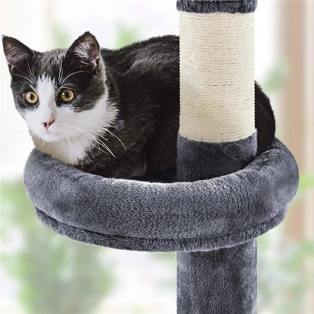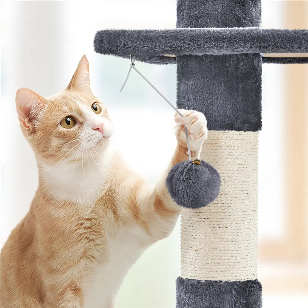 8. Removable & Portable: The top post of this height-adjustable cat tree snugly fits against the ceiling by a tension rod, allowing you to easily relocate it whenever you want without any hassle