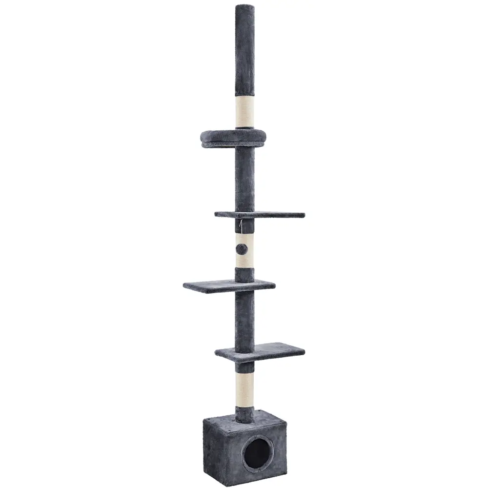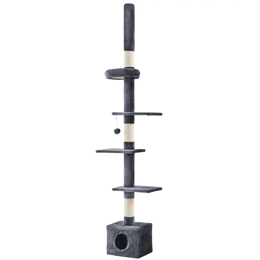 Looking for a quick and convenient way to protect your furniture from those sharp little claws? Look no further than a cat tree! But what if you are short on space? This Floor-to-Ceiling Cat Tree is here to save the day! This cat tower is specially designed for small spaces and adventurous cats. It features four perches, three sisal scratching posts, and a spacious condominium, all within a compact footprint of 16″ L × 12″ W. What’s more, this cat tree is height adjustable, reaching all the way up to a towering 7.4-8.7ft high ceiling. With its sturdy structure and additional wall anchor, you can rest assured that this tall cat tower will not wobble easily. Simple assembly is required for this cat tree tower. All hardware and tools are included for a quick setup.