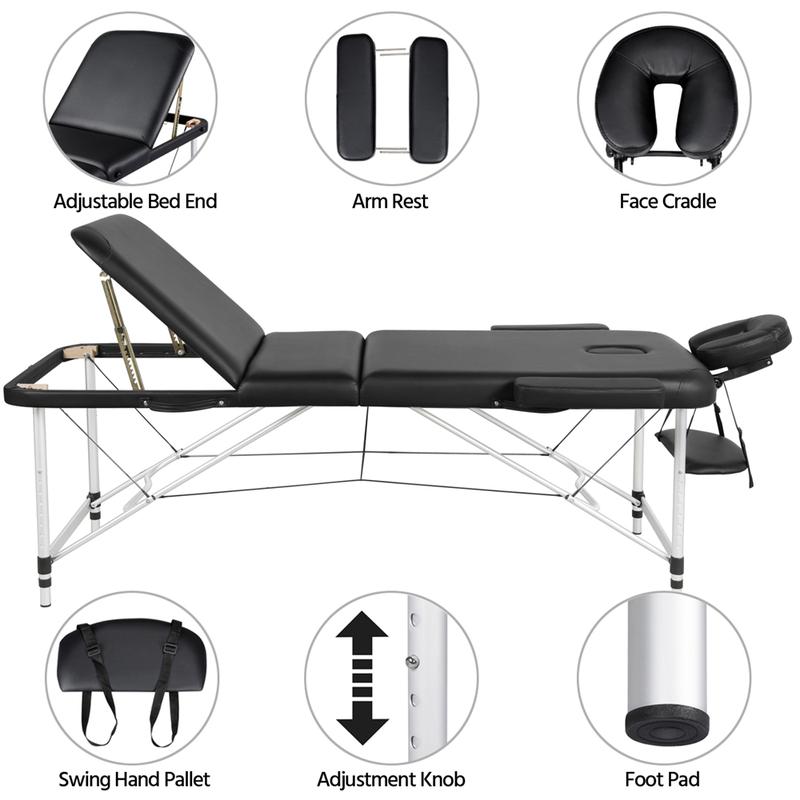 Relax in this adjustable 3 folding massage bed, and enjoy a comfortable massage to reduce stress, sleep better and uplift your mood! The 3 folding facial beauty bed is made of aluminum alloy, beechwood, and soft cushion covered by durable PVC leather. The massage has 3 sections, including an adjustable headrest and backrest, as well as two armrests for your comfort. These accessories are removable if you do not need them. This portable spa couch can meet your needs no matter for professional use or home use, such as home massage, spa, beauty salon, clinic, etc