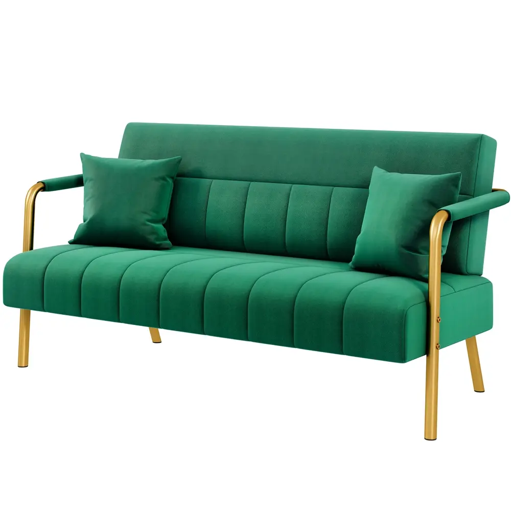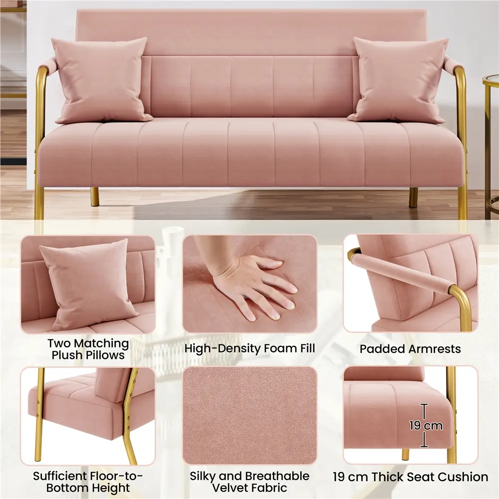 This compact upholstered loveseat (56.5″W ×28″D ×30″H / 143.5×71.5×75.5cm) offers soft, comfortable seating that fits seamlessly in small spaces without overwhelming the area. Built with a CARB P2/E1-compliant engineered wood frame and sturdy gold metal legs, it’s upholstered in luxurious velvet for lasting stability and durability. A slanted backrest, deep cushioned seat and velvet-covered armrests boost relaxation, while high-density foam and multi-layer sinuous springs deliver long-lasting comfort and reliable support. Available in a range of velvet hues, all perfectly paired with gold metal legs, this petite loveseat is a chic addition to any spot—ideal for living rooms, bedrooms, home offices and cozy nooks in apartments or houses.